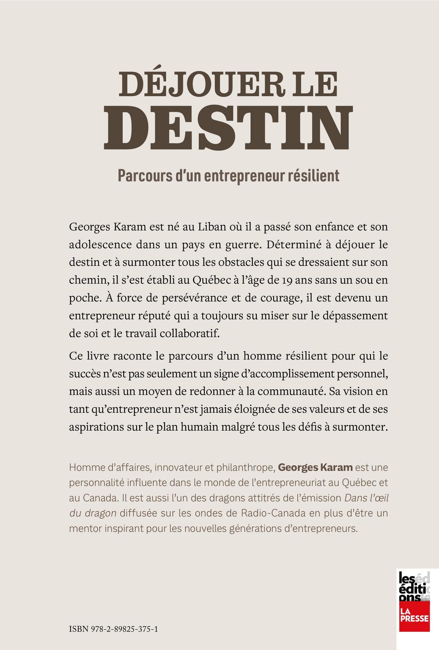 Georges Karam est né au Liban où il a passé son enfance et son adolescence dans un pays en guerre. Déterminé à déjouer le destin et à surmonter tous les obstacles qui se dressaient sur son chemin, il s’est établi au Québec à l’âge de 19 ans sans un sou en poche. À force de persévérance et de courage, il est devenu un entrepreneur réputé qui a toujours su miser sur le dépassement de soi et le travail collaboratif.Ce livre raconte le parcours d’un homme résilient pour qui le succès n’est pas seulement un signe d’accomplissement personnel, mais aussi un moyen de redonner à la communauté. Sa vision en tant qu’entrepreneur n’est jamais éloignée de ses valeurs et de ses aspirations sur le plan humain malgré tous les défis à surmonter.