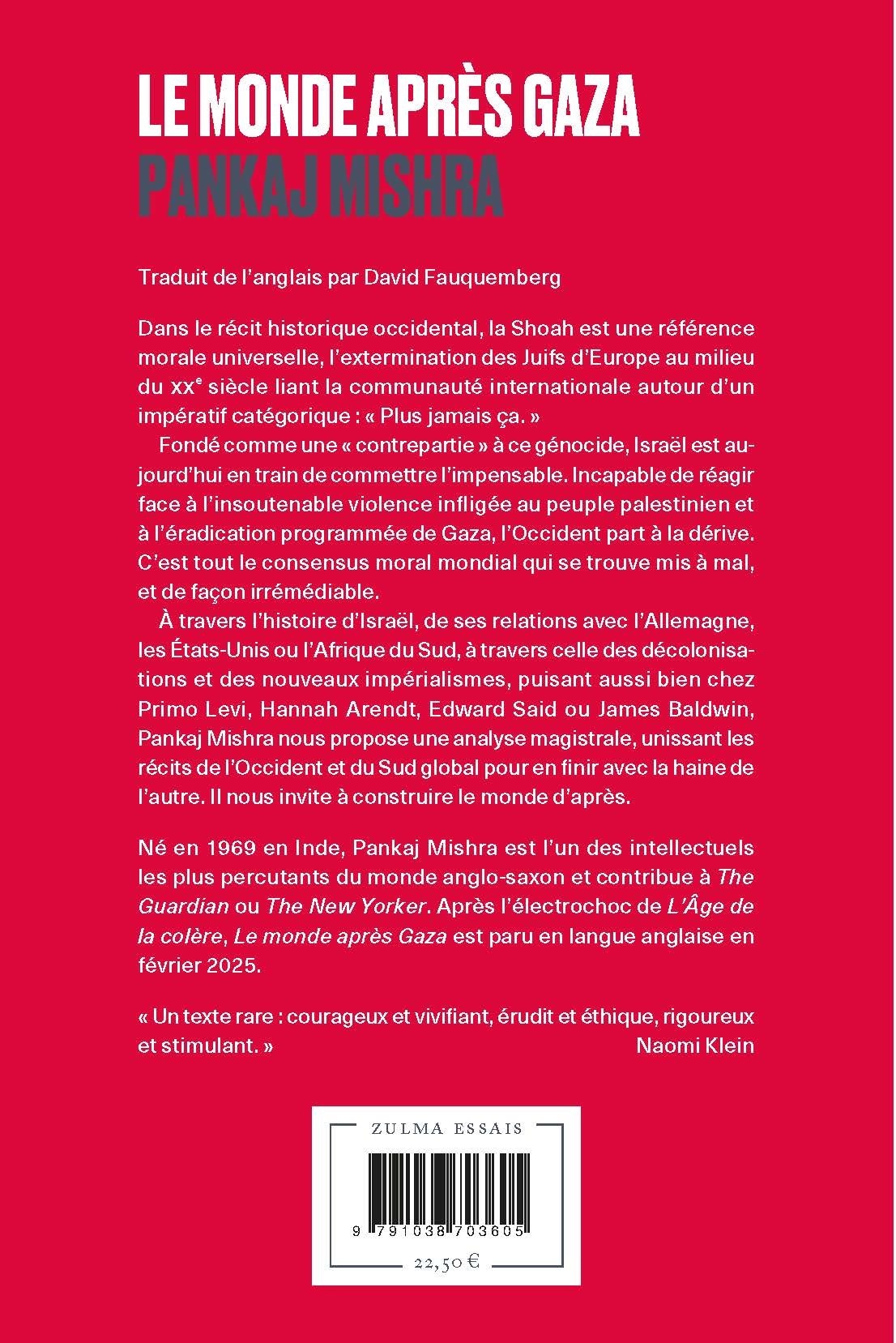 À travers l’histoire d’Israël, de ses relations avec l’Allemagne, les États-Unis ou l’Afrique du Sud, à travers celle des décolonisations et des nouveaux impérialismes, puisant aussi bien chez Primo Levi, Hannah Arendt, Edward Said ou James Baldwin, Pankaj Mishra nous propose une analyse magistrale, unissant les récits de l’Occident et du Sud global pour en finir avec la haine de l’autre. Il nous invite à construire le monde d’après.
