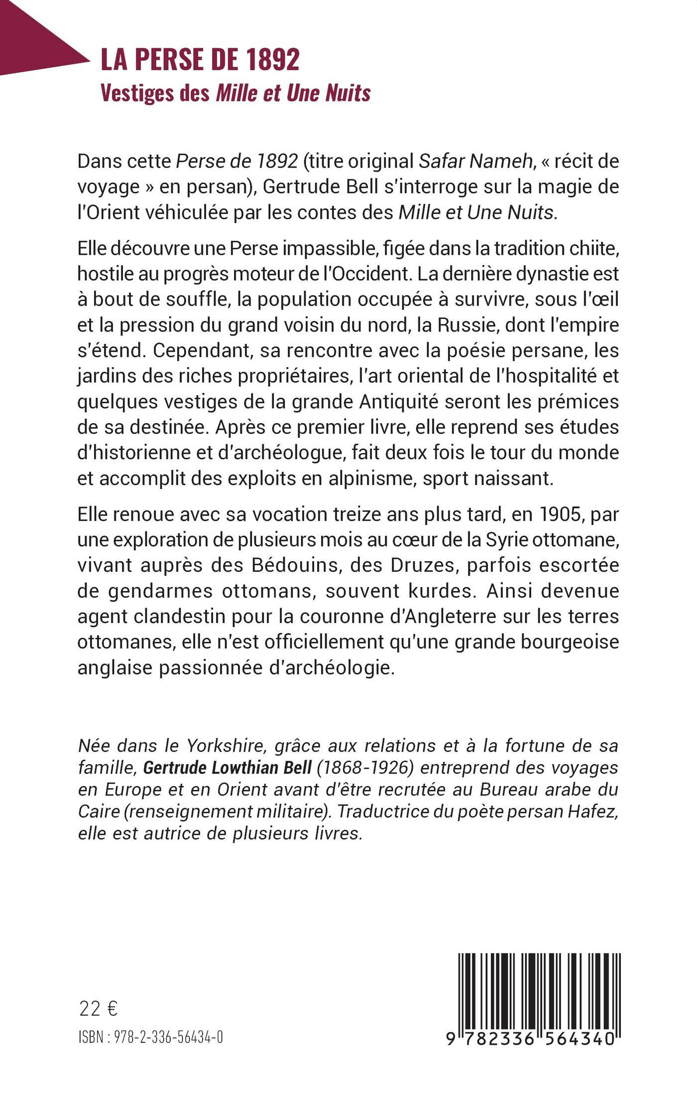 Dans cette Perse de 1892 (titre original Safar Nameh, « récit de voyage » en persan), Gertrude Bell s’interroge sur la magie de l’Orient véhiculée par les contes des Mille et Une Nuits.