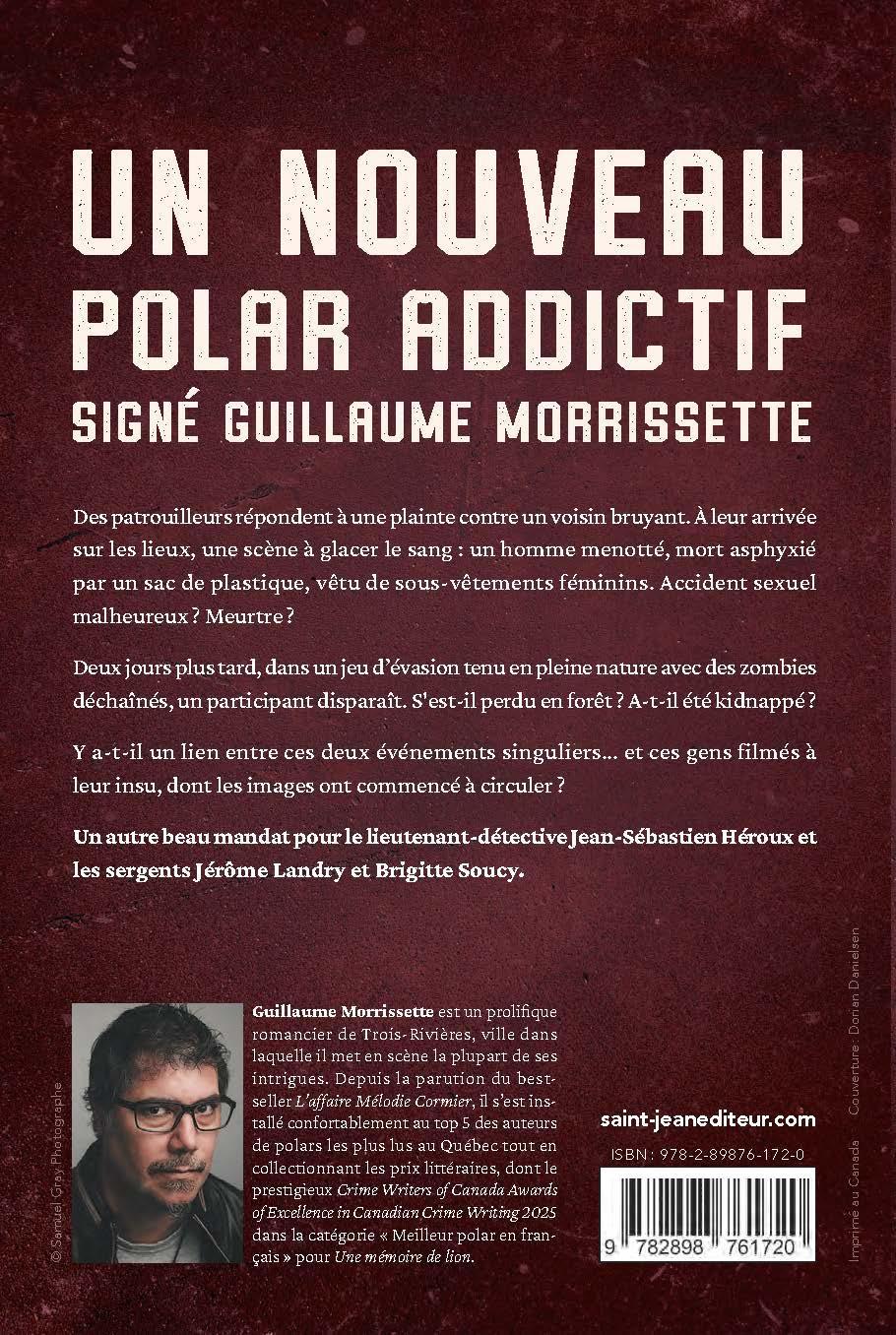 Un nouveau polar addictif signé Guillaume Morrissette Des patrouilleurs répondent à une plainte contre un voisin bruyant. À leur arrivée sur les lieux, une scène à glacer le sang : un homme menotté, mort asphyxié par un sac de plastique, vêtu de sous-vêtements féminins. Accident sexuel malheureux ? Meurtre ?Deux jours plus tard, dans un jeu d’évasion tenu en pleine nature avec des zombies déchaînés, un participant disparaît. S’est-il perdu dans la forêt ? A-t-il été kidnappé ?Y a-t-il un lien entre ces deux événements singuliers… et ces gens filmés à leur insu, dont les images ont commencé à circuler ? Un autre beau mandat pour le lieutenant-détective Jean-Sébastien Héroux et les sergents Jérôme Landry et Brigitte Soucy.