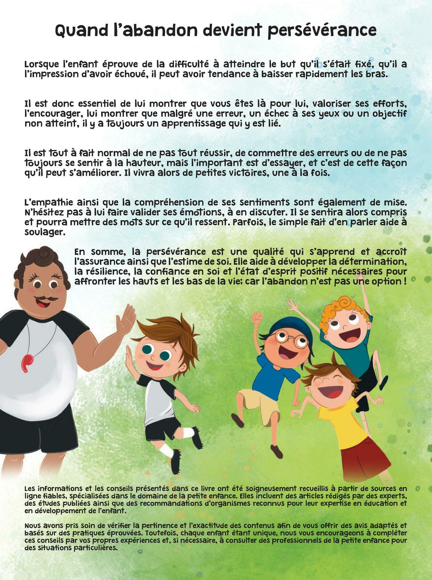 Cédric est toujours aussi heureux de jouer au soccer. Mais un jour, le garçon et son équipe affrontent Les Glorieux. Leurs joueurs très grands, rapides et costauds leur font subir une défaite de 5-0. Malgré ce pointage, leur entraîneur se sent très fier d’eux. Surpris, les garçons se demandent comment ressentir de la fierté lorsqu’il est impossible de marquer ? Monsieur Gaston leur apprendra qu’il est bien plus important de participer, de persévérer et de ne jamais abandonner. Ils comprendront alors que tantôt ils gagneront, tantôt ils perdront, mais que le plus important est que : l’abandon n’est pas une option !