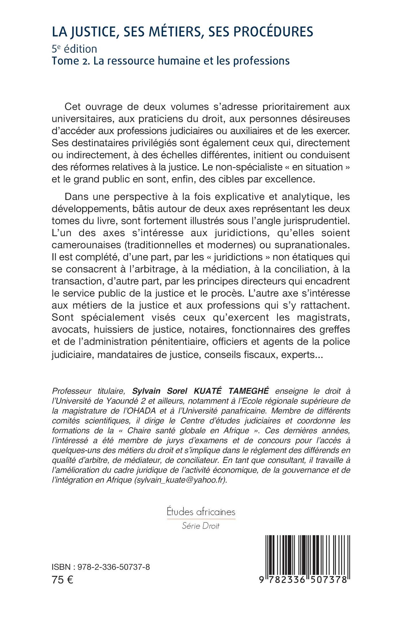 Dans une perspective à la fois explicative et analytique, les développements, bâtis autour de deux axes représentant les deux tomes du livre, sont fortement illustrés sous l’angle jurisprudentiel. L’un des axes s’intéresse aux juridictions, qu’elles soient camerounaises (traditionnelles et modernes) ou supranationales. Il est complété, d’une part, par les «  juridictions  » non étatiques qui se consacrent à l’arbitrage, à la médiation, à la conciliation, à la transaction, d’autre part, par les principes directeurs qui encadrent le service public de la justice et le procès. L’autre axe s’intéresse aux métiers de la justice et aux professions qui s’ y rattachent. Sont spécialement visés ceux qu’exercent les magistrats, avocats, huissiers de justice, notaires, fonctionnaires des greffes et de l’administration pénitentiaire, officiers et agents de la police judiciaire, mandataires de justice, conseils fiscaux, experts...