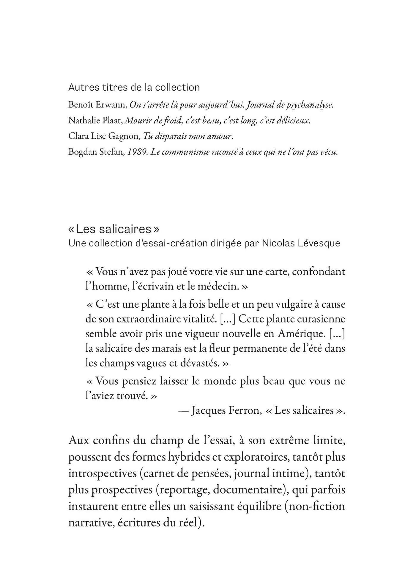 Je dénoue ma parole en tant qu’être humain, mère, grandmère, artiste, psychologue, féministe, femme en cours de révolution personnelle – mon célibat est un territoire libre, libéré. La petite fille, l’adolescente, la jeune femme, les agressées et les réduites au silence que je porte en moi me le demandent, me le commandent. Je tiens à leur offrir mon regard, mes mots, mes réflexions, mon amour, un lieu de solitude créatrice. Je choisis de bousculer la règle de discrétion des psychologues sur leur vie privée, celle des parents qui pensent protéger leurs enfants et petits-enfants en gardant le secret et celle, plus perverse, de la victime muselée. Il n’y a pas eu, à l’époque des faits, de plaintes aux instances policières. Les agresseurs étant maintenant décédés, il n’y en aura pas non plus.Mais écrire, c’est déjà porter plainte – l’espoir de ne plus être seule avec les dommages, l’occasion d’aller chercher des témoins, après coup. Je renonce au droit civil, civilisé, et même à la justice sauvage de l’œil pour œil, dent pour dent, en prenant le pari de miser sur l’œil des lectrices, des lecteurs. Je souhaite ainsi me relier au plus vaste que moi-même.