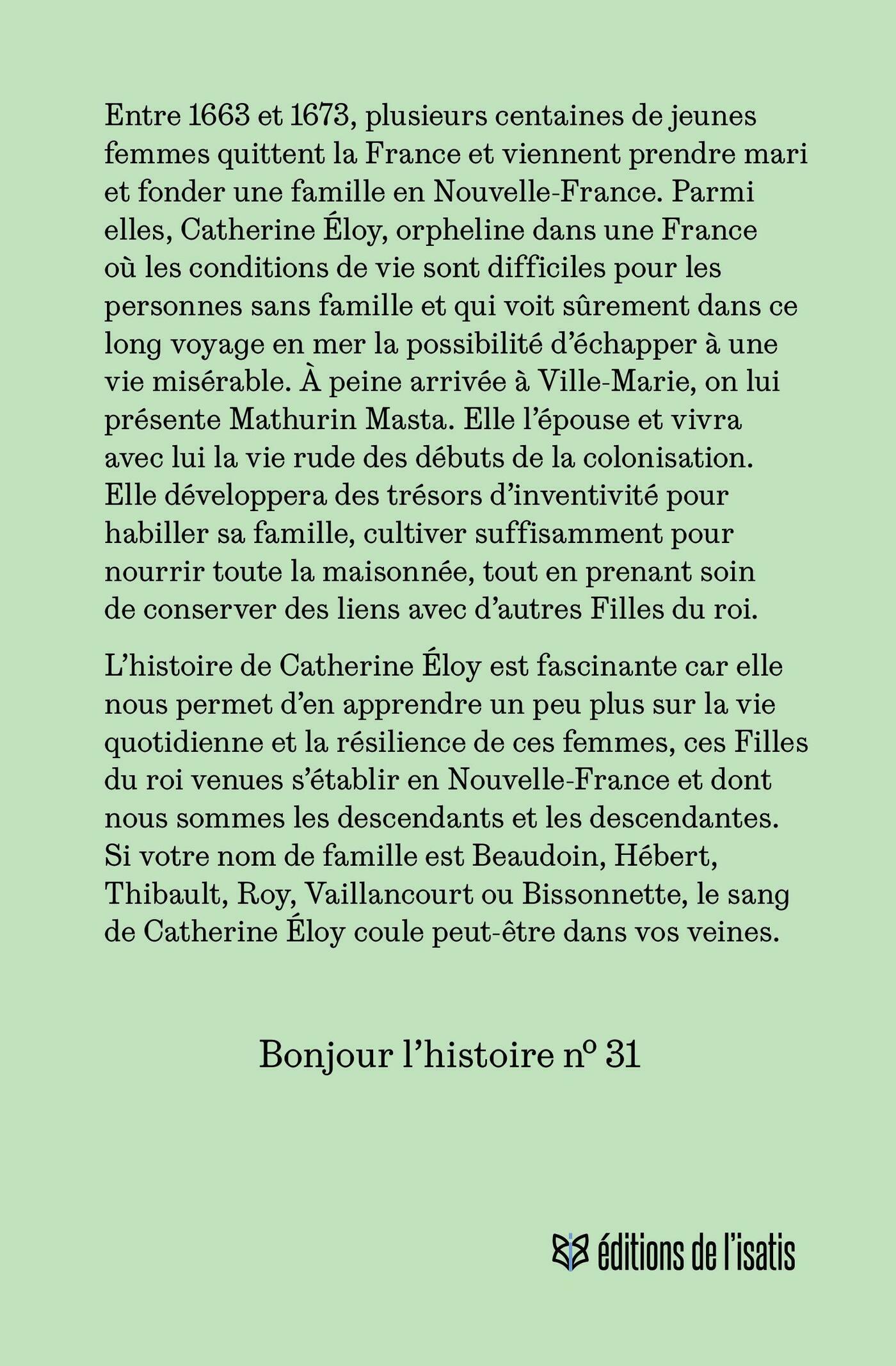 Entre 1663 et 1673, plusieurs centaines de jeunes femmes quittent la France et viennent prendre mari et fonder une famille en Nouvelle-France. Parmi elles, Catherine Éloy, orpheline dans une France où les conditions de vie sont difficiles pour les personnes sans famille et qui voit sûrement dans ce long voyage en mer la possibilité d’échapper à une vie misérable. À peine arrivée à Ville-Marie, on lui présente Mathurin Masta. Elle l’épouse et vivra avec lui la vie rude des débuts de la colonisation. Elle développera des trésors d’inventivité. Pour habiller sa famille, cultiver suffisamment la terre pour nourrir toute la maisonnée, tout en prenant soin de conserver des liens avec d’autres Filles du roi.L’histoire de Catherine Éloy est fascinante car elle nous permet d’en apprendre un peu plus sur la vie quotidienne et la résilience de ces femmes, ces Filles du roi venues s’établir en Nouvelle-France et dont nous sommes les descendants et les descendantes. Si votre nom de famille est Beaudoin, Hébert, Thibault, Roy, Vaillancourt ou Bissonnette, le sang de Catherine Éloy coule peut-être dans vos veines.