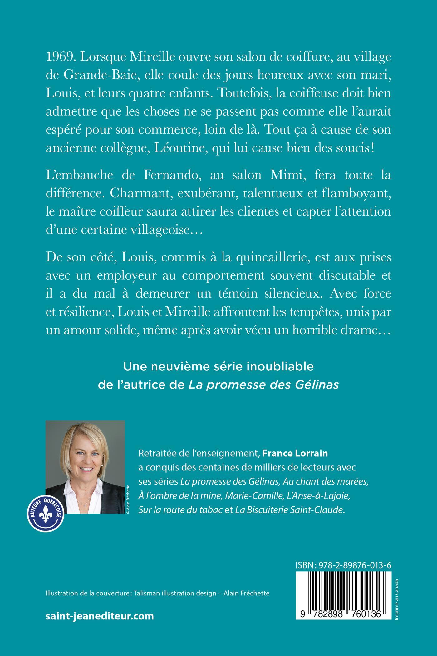 1969. Lorsque Mireille ouvre son salon de coiffure, au village de Grande-Baie, elle coule des jours heureux avec son mari, Louis, et leurs quatre enfants. Toutefois, la coiffeuse doit bien admettre que les choses ne se passent pas comme elle l’aurait espéré pour son commerce, loin de là. Tout ça à cause de son ancienne collègue, Léontine, qui lui cause bien des soucis! L’embauche de Fernando, au salon Mimi, fera toute la différence. Charmant, exubérant, talentueux et flamboyant, le maître-coiffeur saura attirer les clientes et capter l’attention d’une certaine villageoise… De son côté, Louis, commis à la quincaillerie, est aux prises avec un employeur au comportement souvent discutable et il a du mal à demeurer un témoin silencieux. Avec force et résilience, Louis et Mireille affrontent les tempêtes, unis par un amour solide, même après avoir vécu un horrible drame...Une neuvième série inoubliable de l’autrice de La promesse des Gélinas!