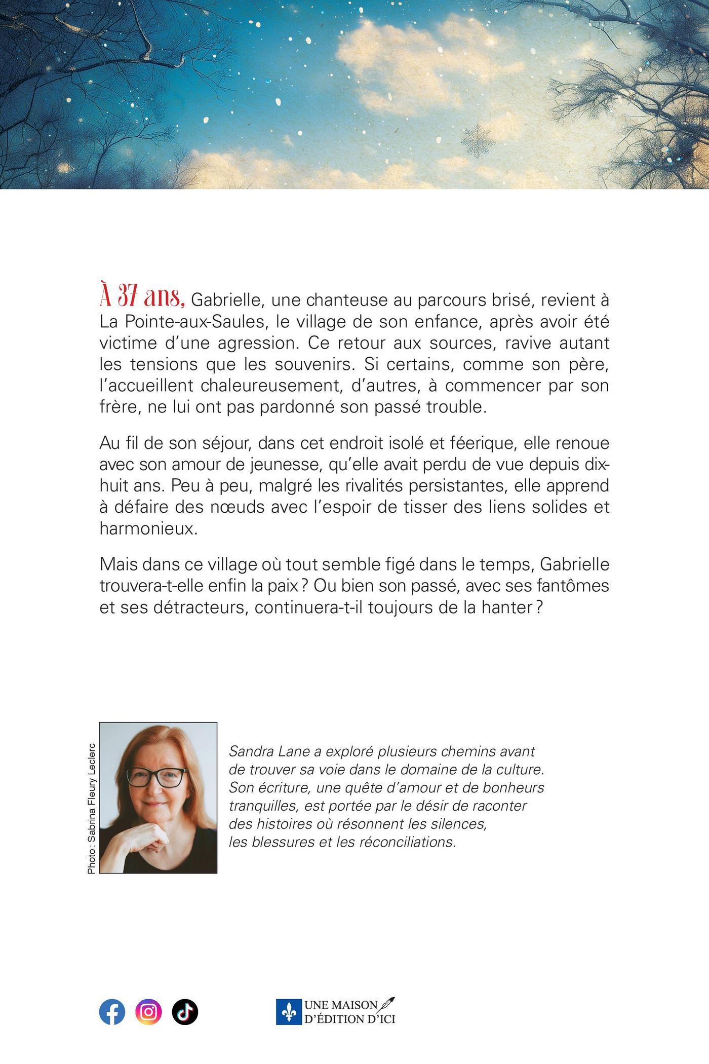À 37 ans, Gabrielle, une chanteuse au parcours brisé, revient à La Pointe-aux-Saules, le village de son enfance, après avoir été victime d’une agression. Ce retour aux sources, ravive autant les tensions que les souvenirs. Si certains, comme son père, l’accueillent chaleureusement, d’autres, à commencer par son frère, ne lui ont pas pardonné son passé trouble. Au fil de son séjour, dans cet endroit isolé et féerique, elle renoue avec son amour de jeunesse, qu’elle avait perdu de vue depuis dix-huit ans. Peu à peu, malgré les rivalités persistantes, elle apprend à défaire des nœuds avec l’espoir de tisser des liens solides et harmonieux. Mais dans ce village où tout semble figé dans le temps, Gabrielle trouvera-t-elle enfin la paix ? Ou bien son passé, avec ses fantômes et ses détracteurs, continuera-t-il toujours de la hanter ?