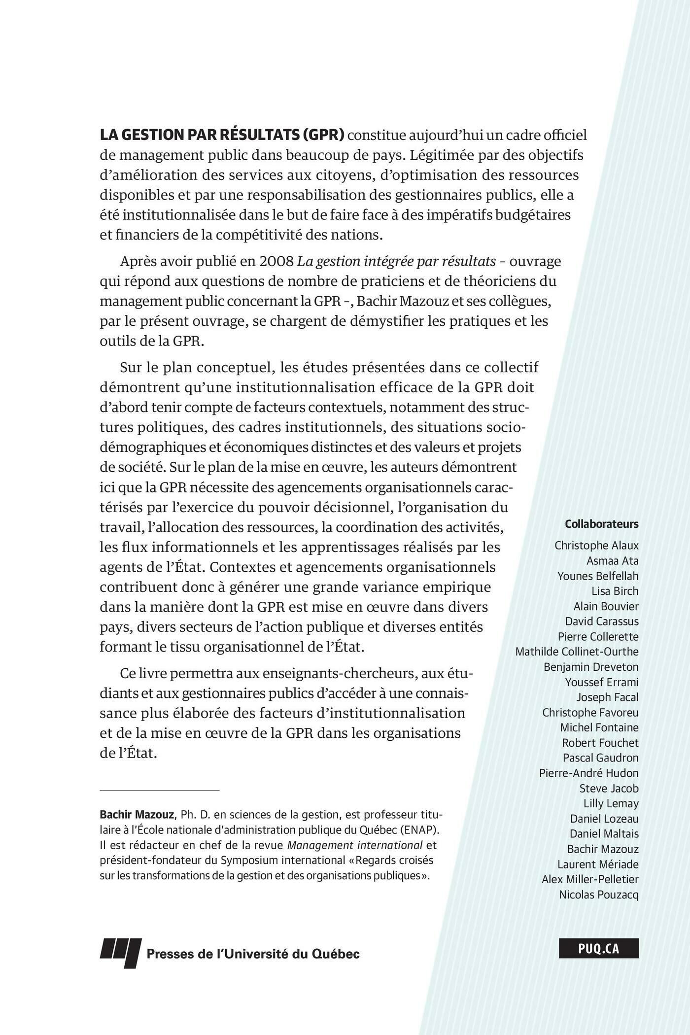La GESTION PAR RÉSULTATS (GPR) constitue aujourd’hui un cadre officiel de management public dans beaucoup de pays. Légitimée par des objectifs d’amélioration des services aux citoyens, d’optimisation des ressources disponibles et par une responsabilisation des gestionnaires publics, elle a été institutionnalisée dans le but de faire face à des impératifs budgétaires et financiers de la compétitivité des nations.Après avoir publié en 2008 La gestion intégrée par résultats – ouvrage qui répond aux questions de nombre de praticiens et de théoriciens du management public concernant la GPR –, Bachir Mazouz et ses collègues, par le présent ouvrage, se chargent de démystifier les pratiques et les outils de la GPR.Sur le plan conceptuel, les études présentées dans ce collectif démontrent qu’une institutionnalisation efficace de la GPR doit d’abord tenir compte de facteurs contextuels, notamment des structures politiques, des cadres institutionnels, des situations sociodémographiques et économiques distinctes et des valeurs et projets de société. Sur le plan de la mise en œuvre, les auteurs démontrent ici que la GPR nécessite des agencements organisationnels caractérisés par l’exercice du pouvoir décisionnel, l’organisation du travail, l’allocation des ressources, la coordination des activités, les flux informationnels et les apprentissages réalisés par les agents de l’État. Contextes et agencements organisationnels contribuent donc à générer une grande variance empirique dans la manière dont la GPR est mise en œuvre dans divers pays, divers secteurs de l’action publique et diverses entités formant le tissu organisationnel de l’État.Ce livre permettra aux enseignants-chercheurs, aux étudiants et aux gestionnaires publics d’accéder à une connaissance plus élaborée des facteurs d’institutionnalisation et de la mise en œuvre de la GPR dans les organisations de l’État.