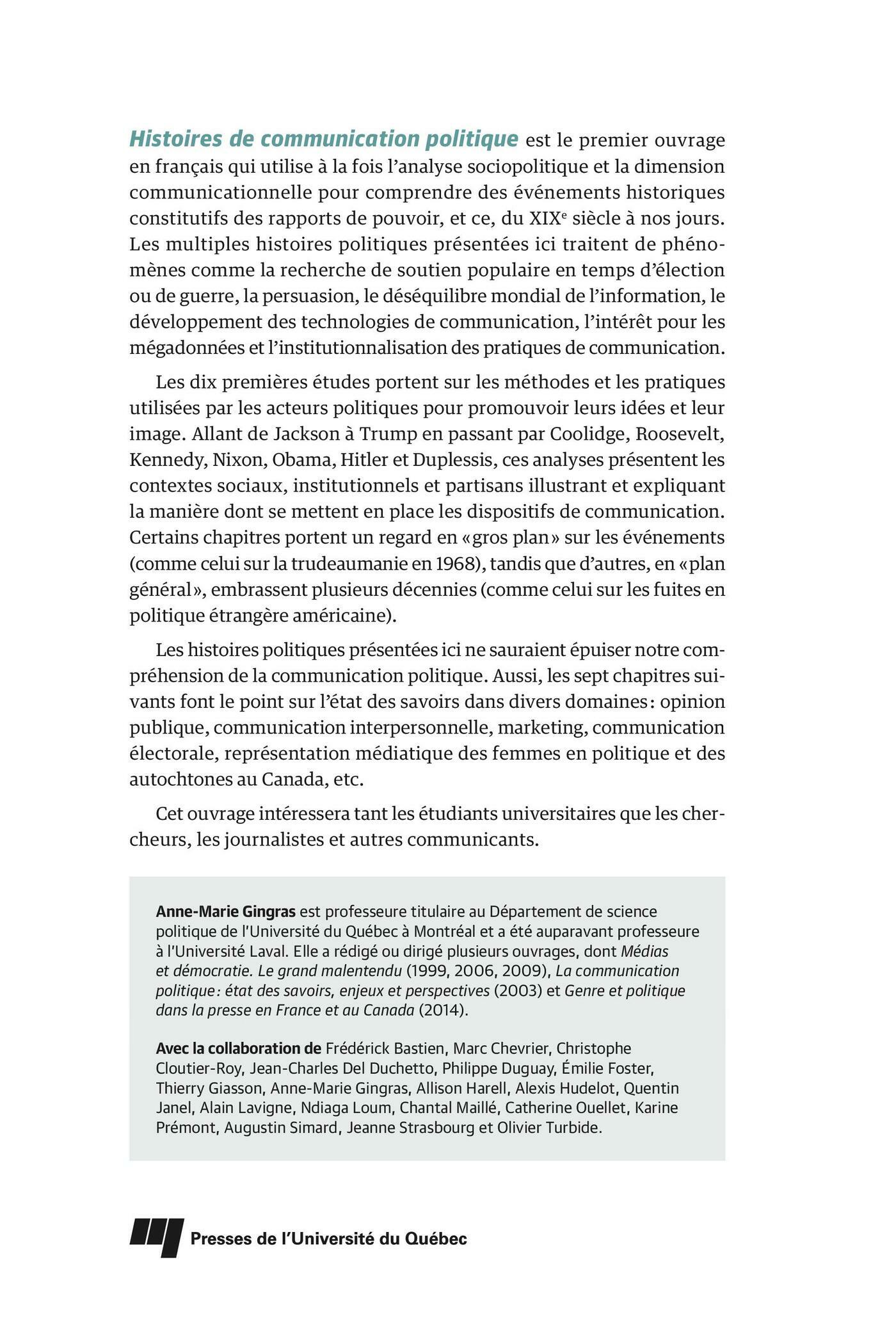 Histoires de communication politique est le premier ouvrage en français qui utilise à la fois l’analyse sociopolitique et la dimension communicationnelle pour comprendre des événements historiques constitutifs des rapports de pouvoir, et ce, du XIXe siècle à nos jours. Les multiples histoires politiques présentées ici traitent de phénomènes comme la recherche de soutien populaire en temps d’élection ou de guerre, la persuasion, le déséquilibre mondial de l’information, le développement des technologies de communication, l’intérêt pour les mégadonnées et l’institutionnalisation des pratiques de communication.Les dix premières études portent sur les méthodes et les pratiques utilisées par les acteurs politiques pour promouvoir leurs idées et leur image. Allant de Jackson à Trump en passant par Coolidge, Roosevelt, Kennedy, Nixon, Obama, Hitler et Duplessis, ces analyses présentent les contextes sociaux, institutionnels et partisans illustrant et expliquant la manière dont se mettent en place les dispositifs de communication. Certains chapitres portent un regard en « gros plan » sur les événements (comme celui sur la trudeaumanie en 1968), tandis que d’autres, en « plan général », embrassent plusieurs décennies (comme celui sur les fuites en politique étrangère américaine).Les histoires politiques présentées ici ne sauraient épuiser notre compréhension de la communication politique. Aussi, les sept chapitres suivants font le point sur l’état des savoirs dans divers domaines : opinion publique, communication interpersonnelle, marketing, communication électorale, représentation médiatique des femmes en politique et des autochtones au Canada, etc. Cet ouvrage intéressera tant les étudiants universitaires que les chercheurs, les journalistes et autres communicants.