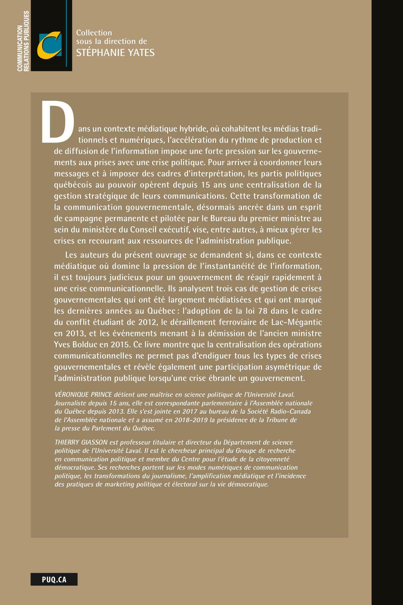 Dans un contexte médiatique hybride, où cohabitent les médias traditionnels et numériques, l’accélération du rythme de production et de diffusion de l’information impose une forte pression sur les gouvernements aux prises avec une crise politique. Pour arriver à coordonner leurs messages et à imposer des cadres d’interprétation, les partis politiques québécois au pouvoir opèrent depuis 15 ans une centralisation de la gestion stratégique de leurs communications. Cette transformation de la communication gouvernementale, désormais ancrée dans un esprit de campagne permanente et pilotée par le Bureau du premier ministre au sein du ministère du Conseil exécutif, vise, entre autres, à mieux gérer les crises en recourant aux ressources de l’administration publique.Les auteurs du présent ouvrage se demandent si, dans ce contexte médiatique où domine la pression de l’instantanéité de l’information, il est toujours judicieux pour un gouvernement de réagir rapidement à une crise communicationnelle. Ils analysent trois cas de gestion de crises gouvernementales qui ont été largement médiatisées et qui ont marqué les dernières années au Québec : l’adoption de la loi 78 dans le cadre du conflit étudiant de 2012, le déraillement ferroviaire de Lac-Mégantic en 2013, et les événements menant à la démission de l’ancien ministre Yves Bolduc en 2015. Ce livre montre que la centralisation des opérations communicationnelles ne permet pas d’endiguer tous les types de crises gouvernementales et révèle également une participation asymétrique de l’administration publique lorsqu’une crise ébranle un gouvernement.Véronique Prince détient une maîtrise en science politique de l’Université Laval. Journaliste depuis 15 ans, elle est correspondante parlementaire à l’Assemblée nationale du Québec depuis 2013. Elle s’est jointe en 2017 au bureau de la Société Radio-Canada de l’Assemblée nationale et a assumé en 2018-2019 la présidence de la Tribune de la presse du Parlement du Québec.Thierry Giasson est professeur titulaire et directeur du Département de science politique de l’Université Laval. Il est le chercheur principal du Groupe de recherche en communication politique et membre du Centre pour l’étude de la citoyenneté démocratique. Ses recherches portent sur les modes numériques de communication politique, les transformations du journalisme, l’amplification médiatique et l’incidence des pratiques de marketing politique et électoral sur la vie démocratique.