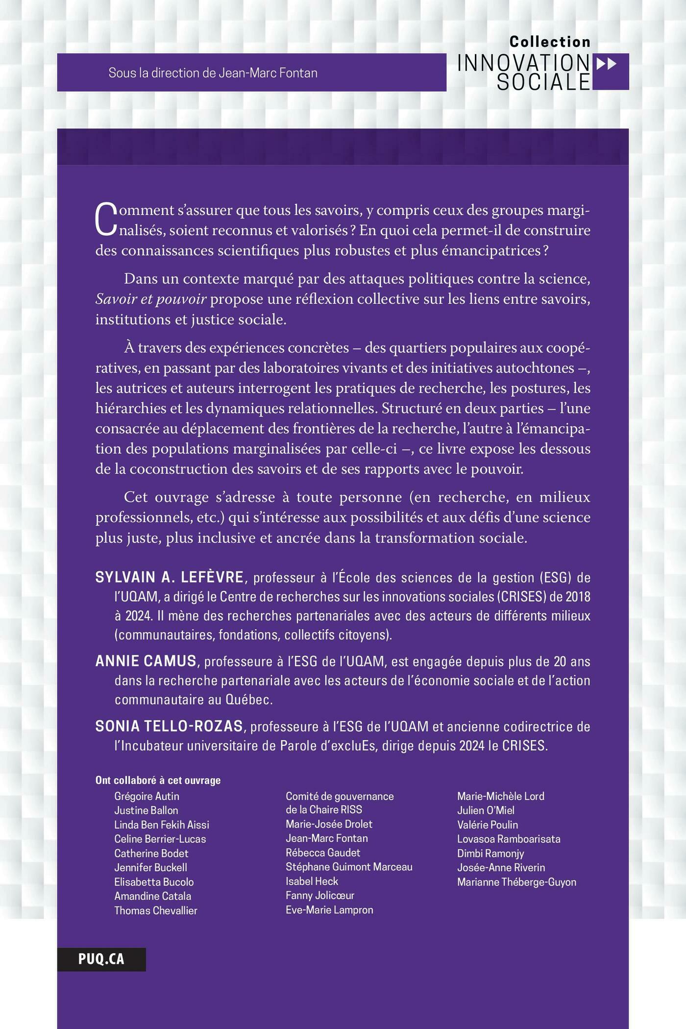Cet ouvrage s’adresse à toute personne (en recherche, en milieux professionnels, etc.) qui s’intéresse aux possibilités et aux défis d’une science plus juste, plus inclusive et ancrée dans la transformation sociale.