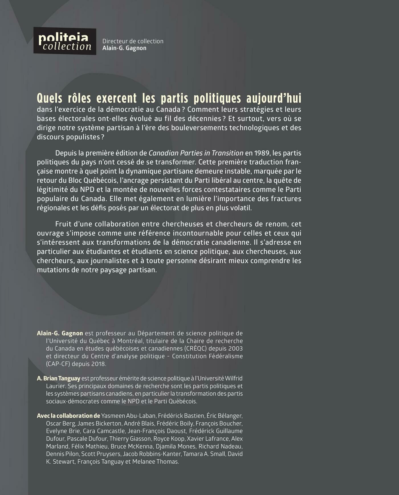 Depuis la première édition de Canadian Parties in Transition en 1989, les partis politiques du pays n’ont cessé de se transformer. Cette première traduction française montre à quel point la dynamique partisane demeure instable, marquée par le retour du Bloc Québécois, l’ancrage persistant du Parti libéral au centre, la quête de légitimité du NPD et la montée de nouvelles forces contestataires comme le Parti populaire du Canada. Elle met également en lumière l’importance des fractures régionales et les défis posés par un électorat de plus en plus volatil.
