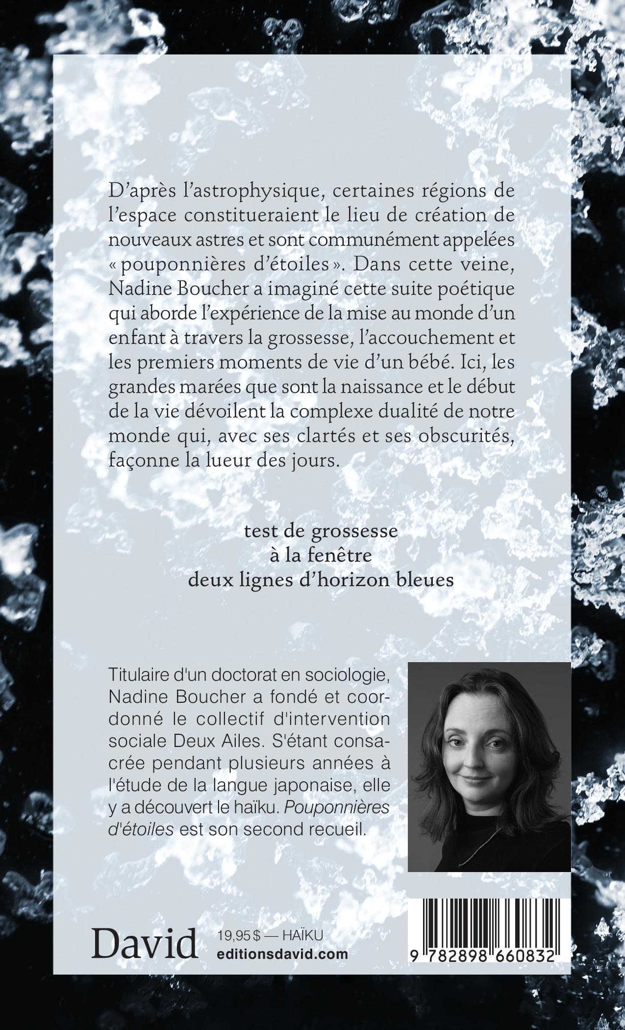 D’après l’astrophysique, certaines régions de l’espace constitueraient le lieu de création de nouveaux astres et sont communément appelées « pouponnières d’étoiles ». Dans cette veine, Nadine Boucher a imaginé cette suite poétique qui aborde l’expérience de la mise au monde d’un enfant à travers la grossesse, l’accouchement et les premiers moments de vie d’un bébé. Ici, les grandes marées que sont la naissance et le début de la vie dévoilent la complexe dualité de notre monde qui, avec ses clartés et ses obscurités, façonne la lueur des jours.test de grossesseà la fenêtredeux lignes d’horizon bleuesTitulaire d'un doctorat en sociologie, Nadine Boucher a fondé et coordonné le collectif d'intervention sociale Deux Ailes. S'étant consacrée pendant plusieurs années à l'étude de la langue japonaise, elle y a découvert le haïku. Pouponnières d'étoiles est son second recueil.