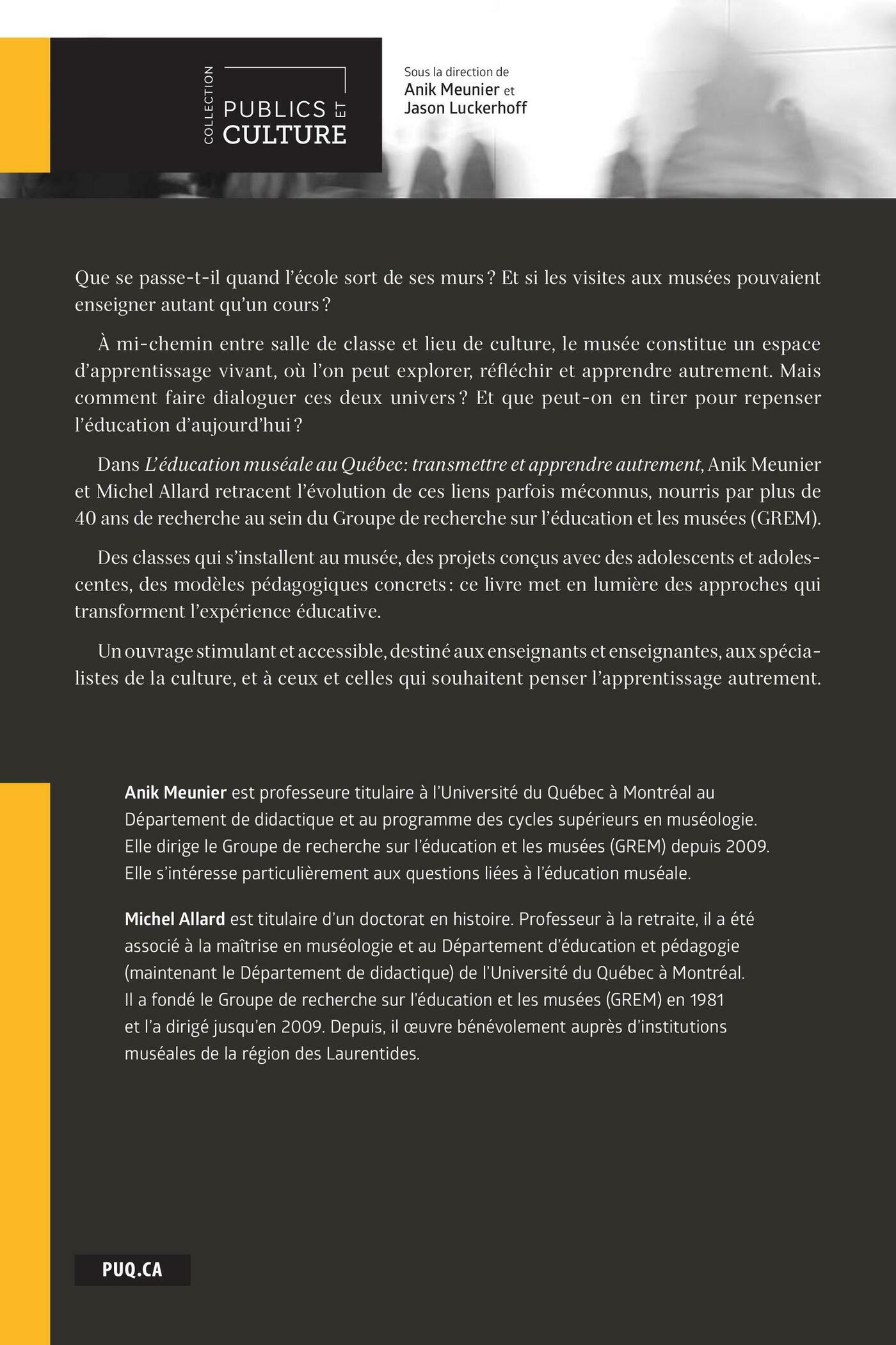 Dans L’éducation muséale au Québec : transmettre et apprendre autrement, Anik Meunier et Michel Allard retracent l’évolution de ces liens parfois méconnus, nourris par plus de 40 ans de recherche au sein du Groupe de recherche sur l’éducation et les musées (GREM).