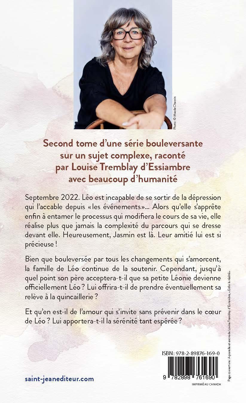 Second tome d’une série bouleversante sur un sujet complexe, raconté par Louise Tremblay d’Essiambre avec beaucoup d’humanitéSeptembre 2022. Léo est incapable de se sortir de la dépression qui l’accable depuis « les événements »… Alors qu’elle s’apprête enfin à entamer le processus qui modifiera le cours de sa vie, elle réalise plus que jamais la complexité du parcours qui se dresse devant elle. Heureusement, Jasmin est là. Leur amitié lui est si précieuse !Bien que bouleversée par tous les changements qui s’amorcent, la famille de Léo continue de la soutenir. Cependant, jusqu’à quel point son père acceptera-t-il que sa petite Léonie devienne officiellement Léo ? Lui offrira-t-il de prendre éventuellement sa relève à la quincaillerie ? Et qu’en est-il de l’amour qui s’invite sans prévenir dans le cœur de Léo ? Lui apportera-t-il la sérénité tant espérée ?