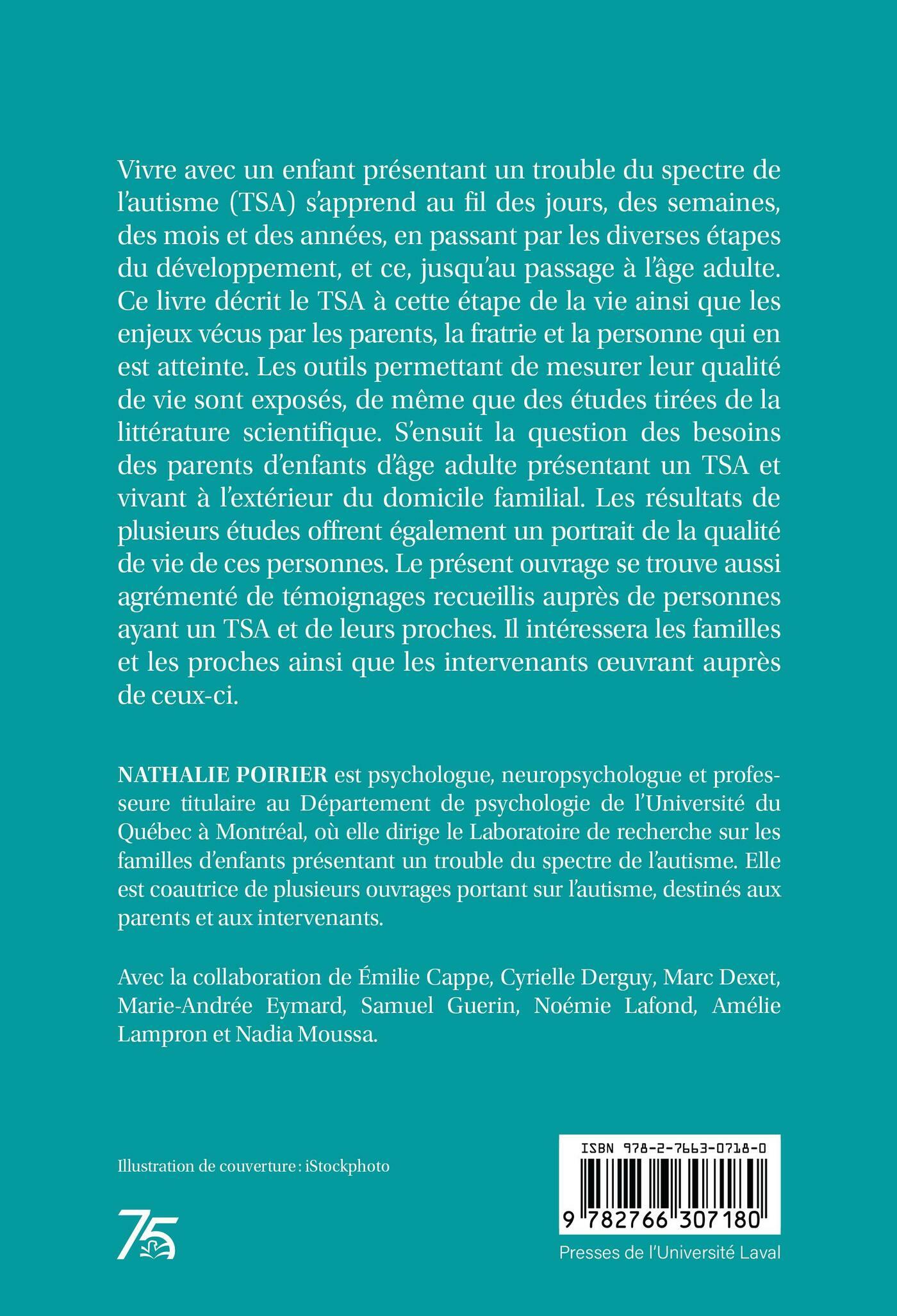 Vivre avec un enfant présentant un trouble du spectre de l’autisme (TSA) s’apprend au fil des jours, des semaines, des mois et des années, en passant par les diverses étapes du développement, et ce, jusqu’au passage à l’âge adulte. Ce livre décrit le TSA à cette étape de la vie ainsi que les enjeux vécus par les parents, la fratrie et la personne qui en est atteinte. Les outils permettant de mesurer leur qualité de vie sont exposés, de même que des études tirées de la littérature scientifique. S’ensuit la question des besoins des parents d’enfants d’âge adulte présentant un TSA et vivant à l’extérieur du domicile familial. Les résultats de plusieurs études offrent également un portrait de la qualité de vie de ces personnes. Le présent ouvrage se trouve aussi agrémenté de témoignages recueillis auprès de personnes atteintes d’un TSA et de leurs proches. Il intéressera les familles et les proches ainsi que les intervenants œuvrant auprès de ceux-ci.