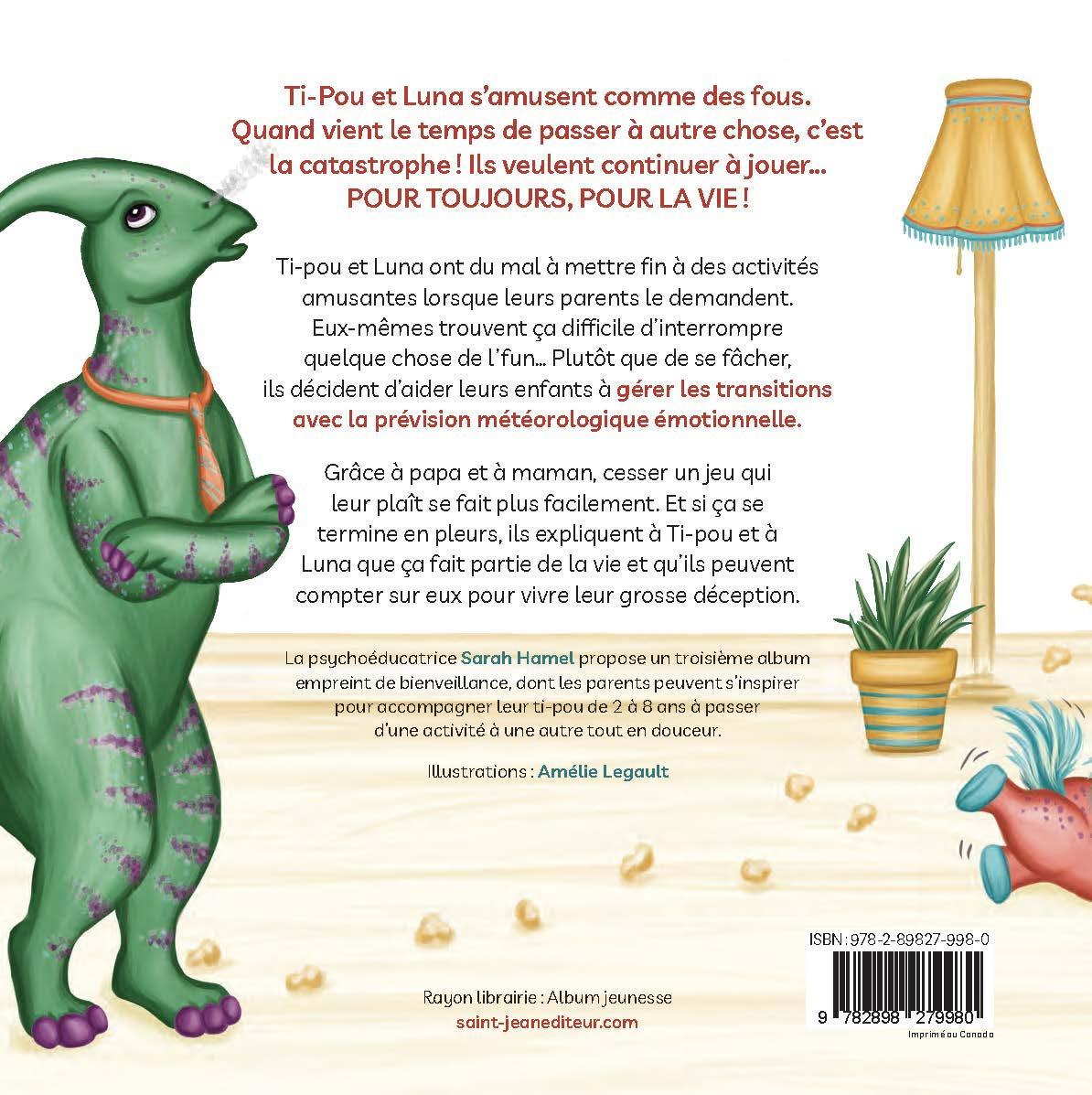 Luna et Ti-Pou s’amusent comme des fous.Quand vient le temps de passer à autre chose, c’est la catastrophe !Ti-pou et Luna veulent continuer à jouer…POUR TOUJOURS, POUR LA VIE !Ti-pou et Luna ont du mal à mettre fin à des activités amusantes lorsque leurs parents le demandent. Eux-mêmes trouvent ça difficile d’interrompre quelque chose de l’fun… Plutôt que de se fâcher et de leur imposer des ultimatums, ils décident d’aider leurs enfants à gérer les transitions avec la prévision météorologique émotionnelle.Grâce à papa et maman, cesser un jeu qui leur plaît se fait plus facilement. Et si ça se termine en pleurs, ils expliquent à Ti-pou et à Luna que ça fait partie de la vie et qu’ils peuvent compter sur eux pour vivre leur grosse déception.La psychoéducatrice Sarah Hamel propose un troisième album empreint de bienveillance, dont les parents peuvent s’inspirer pour accompagner leur ti-pou de 2 à 8 ans à passer d’une activité à une autre tout en douceur.Illustrations : Amélie Legault