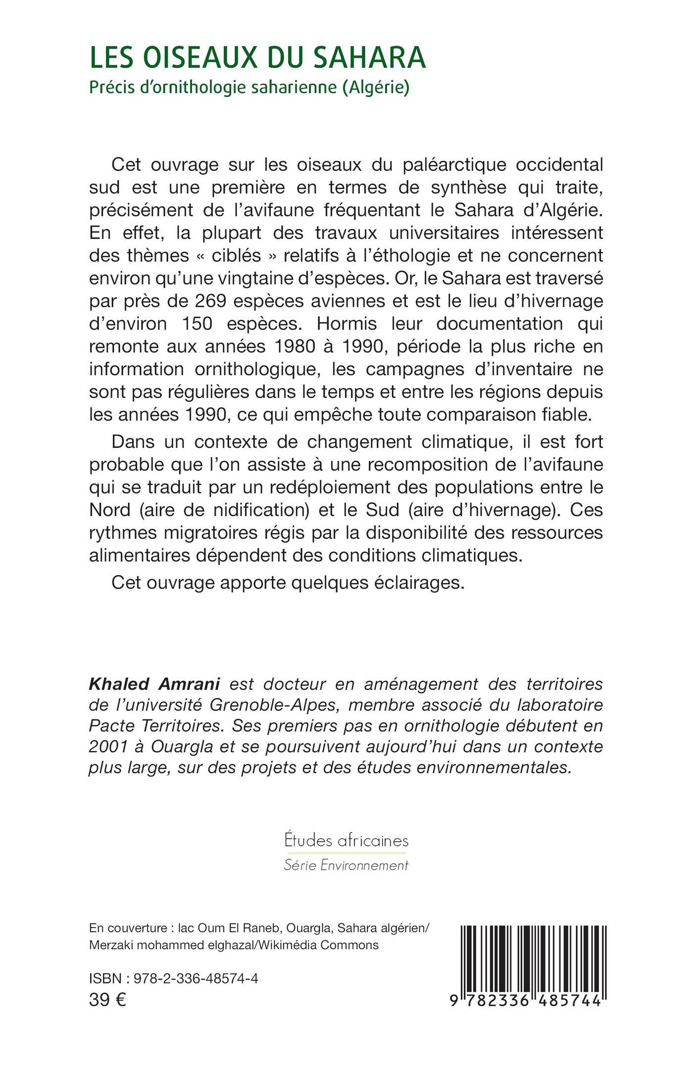 Cet ouvrage sur les oiseaux du paléarctique occidental sud est une première en termes de synthèse qui traite, précisément de l’avifaune fréquentant le Sahara d’Algérie. En effet, la plupart des travaux universitaires intéressent des thèmes « ciblés » relatifs à l’éthologie et ne concernent environ qu’une vingtaine d’espèces. Or, le Sahara est traversé par près de 269 espèces aviennes et est le lieu d’hivernage d’environ 150 espèces. Hormis leur documentation qui remonte aux années 1980 à 1990, période la plus riche en information ornithologique, les campagnes d’inventaire ne sont pas régulières dans le temps et entre les régions depuis les années 1990, ce qui empêche toute comparaison fiable.