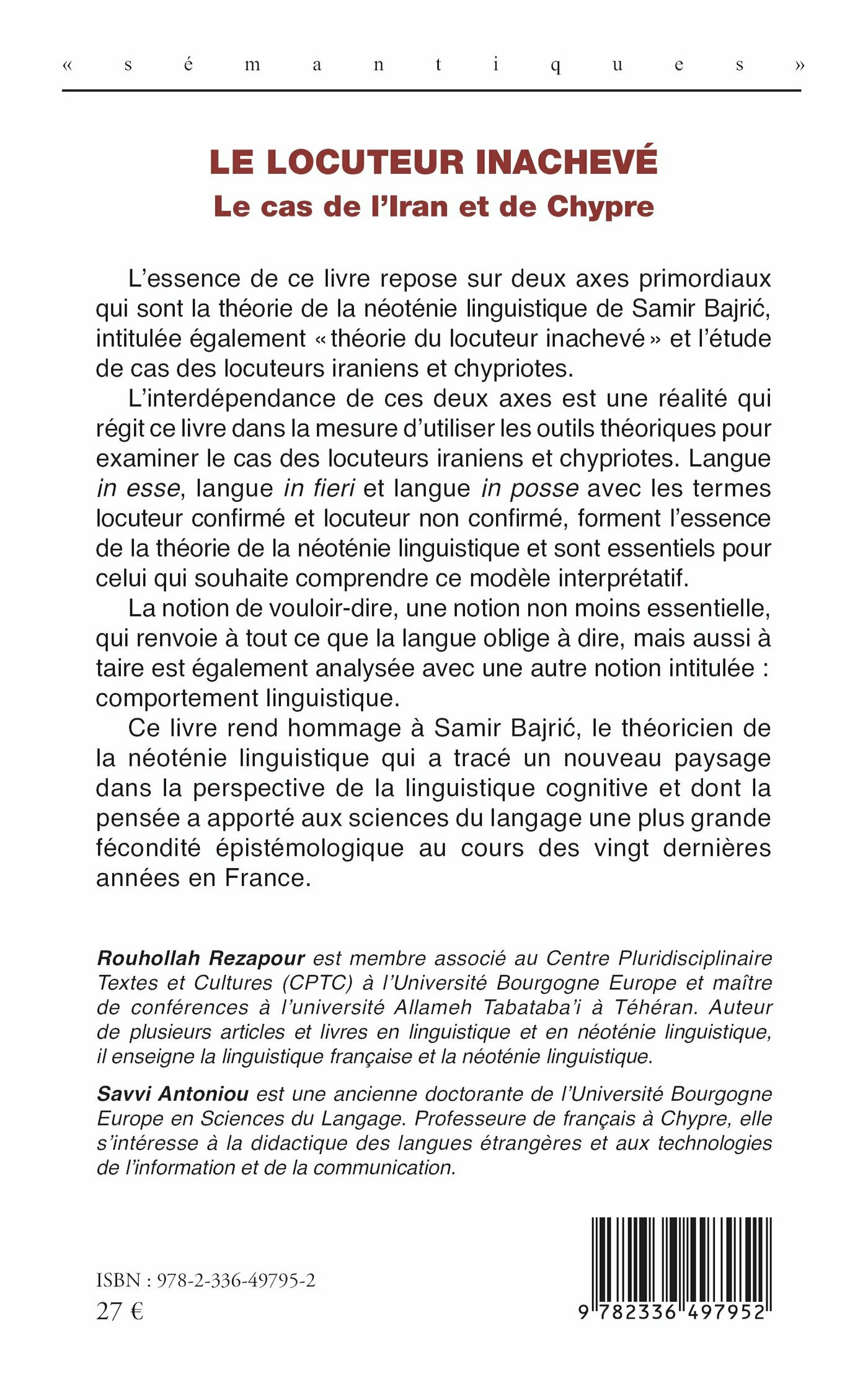 L’essence de ce livre repose sur deux axes primordiaux qui sont la théorie de la néoténie linguistique de Samir Bajrić, intitulée également « théorie du locuteur inachevé » et l’étude de cas des locuteurs iraniens et chypriotes.