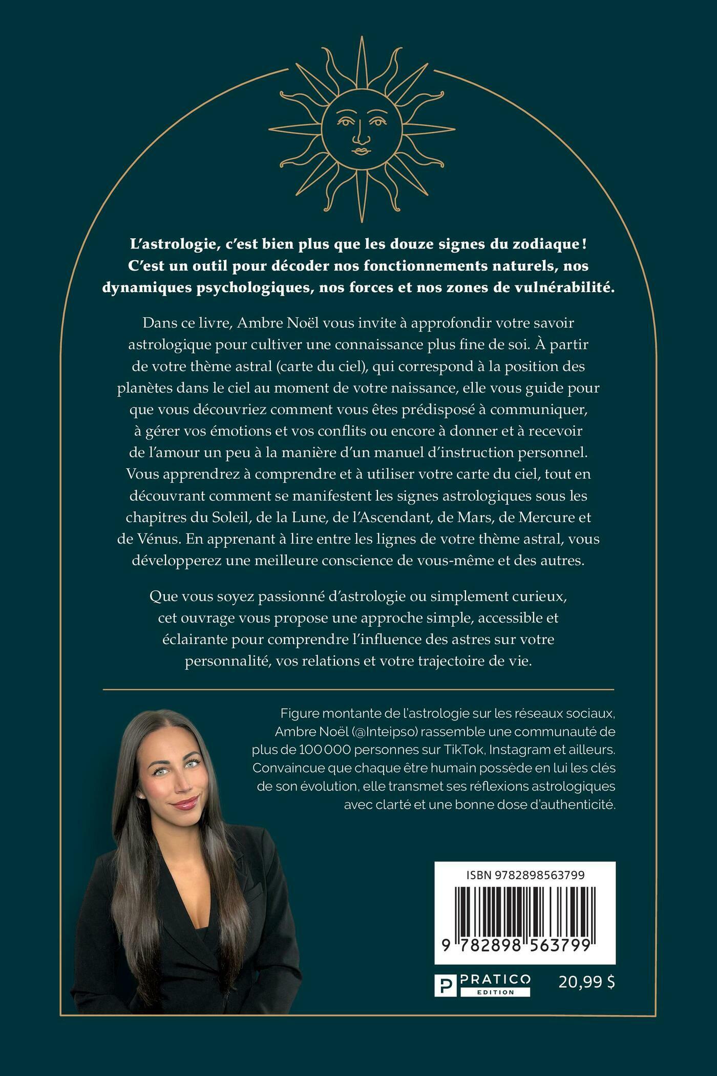 L’astrologie, c’est bien plus que les douze signes du zodiaque ! C’est un outil pour décoder nos fonctionnements naturels, nos dynamiques psychologiques, nos forces et nos zones de vulnérabilité. Dans ce livre, Ambre Noël vous invite à approfondir votre savoir astrologique pour cultiver une connaissance plus fine de soi. À partir de votre thème astral (carte du ciel), qui correspond à la position des planètes dans le ciel au moment de votre naissance, elle vous guide pour que vous découvriez comment vous êtes prédisposé à communiquer, à gérer vos émotions et vos conflits ou encore à donner et à recevoir de l’amour un peu à la manière d’un manuel d’instruction personnel. Vous apprendrez à comprendre et à utiliser votre carte du ciel, tout en découvrant comment se manifestent les signes astrologiques sous les chapitres du Soleil, de la Lune, de l’Ascendant, de Mars, de Mercure et de Vénus. En apprenant à lire entre les lignes de votre thème astral, vous développerez une meilleure conscience de vous-même et des autres. Que vous soyez passionné d’astrologie ou simplement curieux, cet ouvrage vous propose une approche simple, accessible et éclairante pour comprendre l’influence des astres sur votre personnalité, vos relations et votre trajectoire de vie.