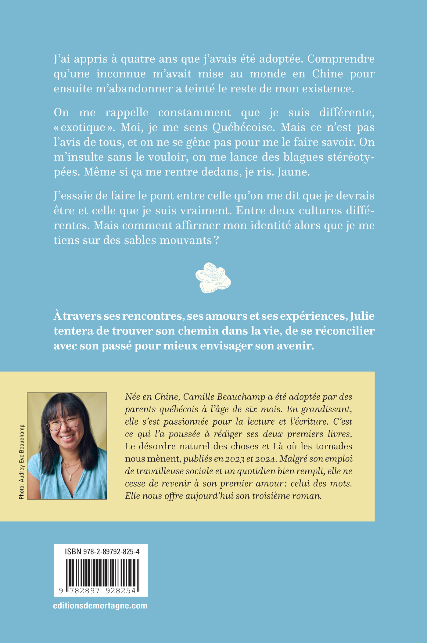 J’ai appris à quatre ans que j’avais été adoptée. Comprendre qu’une inconnue m’avait mise au monde en Chine pour ensuite m’abandonner a teinté le reste de mon existence.On me rappelle constamment que je suis différente, « exotique ». Moi, je me sens Québécoise. Mais ce n’est pas l’avis de tous, et on ne se gêne pas pour me le faire savoir. On m’insulte sans le vouloir, on me lance des blagues stéréotypées. Même si ça me rentre dedans, je ris. Jaune. J’essaie de faire le pont entre celle qu’on me dit que je devrais être et celle que je suis vraiment. Entre deux cultures différentes. Mais comment affirmer mon identité alors que je me tiens sur des sables mouvants ?À travers ses rencontres, ses amours et ses expériences, Julie tentera de trouver son chemin dans la vie, de se réconcilier avec son passé pour mieux envisager son avenir.