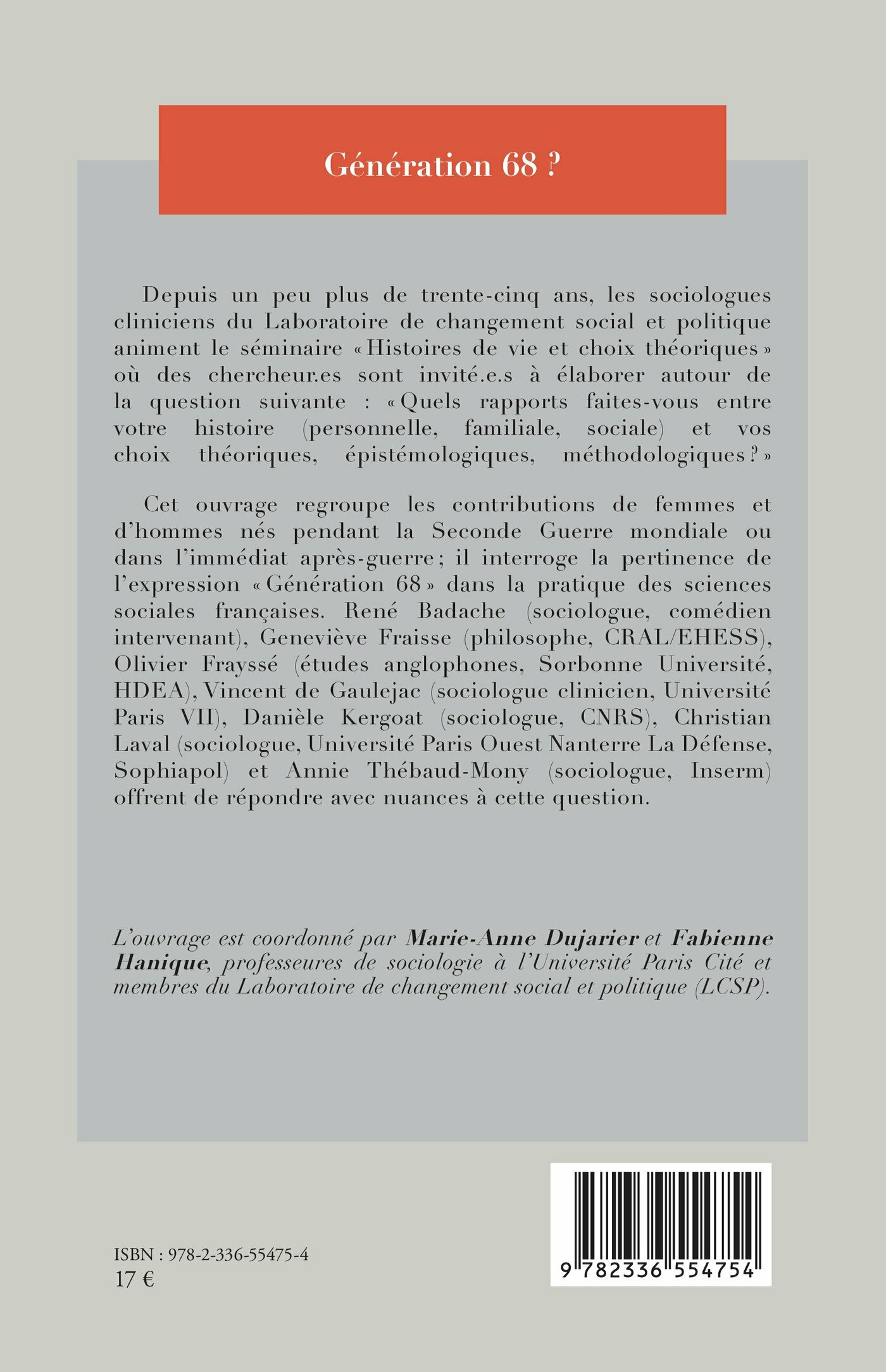 Cet ouvrage regroupe les contributions de femmes et d’hommes nés pendant la Seconde Guerre mondiale ou dans l’immédiat après-guerre ; il interroge la pertinence de l’expression « Génération 68 » dans la pratique des sciences sociales françaises. René Badache (sociologue, comédien intervenant), Geneviève Fraisse (philosophe, CRAL/EHESS), Olivier Frayssé (professeur en études anglophones, Sorbonne Université, HDEA), Vincent de Gaulejac (sociologue clinicien, Université Paris VII), Danièle Kergoat (sociologue, CNRS), Christian Laval (sociologue, Université Paris Ouest Nanterre La Défense, Sophiapol) et Annie Thébaud-Mony (sociologue, Inserm) offrent de répondre avec nuances à cette question.