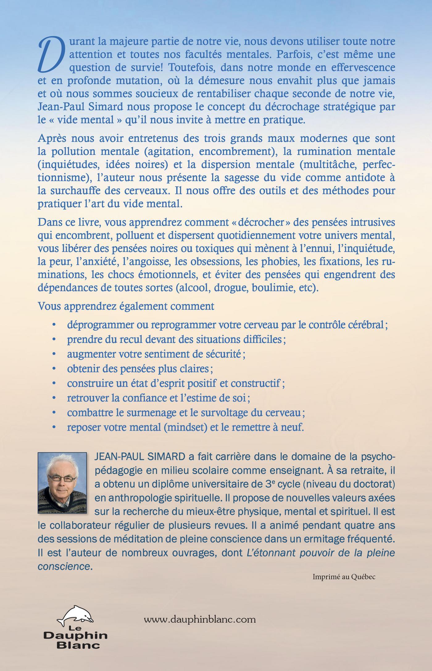 Durant la majeure partie de notre vie, nous devons utiliser toute notre attention et toutes nos facultés mentales. Parfois, c’est même une question de survie! Toutefois, dans notre monde en effervescence et en profonde mutation, où la démesure nous envahit plus que jamais et où nous sommes soucieux de rentabiliser chaque seconde de notre vie, Jean-Paul Simard nous propose le concept du décrochage stratégique par le « vide mental » qu’il nous invite à mettre en pratique.Après nous avoir entretenus des trois grands maux modernes que sont la pollution mentale (agitation, encom- brement), la rumination mentale (inquiétudes, idées noires) et la dispersion mentale (multitâche, perfectionnisme), l’auteur nous présente la sagesse du vide comme antidote à la surchauffe des cerveaux. Il nous offre des outils et des méthodes pour pratiquer l’art du vide mental.Dans ce livre, vous apprendrez comment «décrocher» des pensées intrusives qui encombrent, polluent et dispersent quotidiennement votre univers mental, vous libérer des pensées noires ou toxiques qui mènent à l’ennui, l’inquiétude, la peur, l’anxiété, l’angoisse, les obsessions, les phobies, les fixations, les ruminations, les chocs émotionnels, et éviter des pensées qui engendrent des dépendances de toutes sortes (alcool, drogue, boulimie, etc).L'auteur:JEAN-PAUL SIMARD a fait carrière dans le domaine de la psychopédagogie en milieu scolaire comme enseignant. À sa retraite, il a obtenu un diplôme universitaire de 3e cycle (niveau du doctorat) en anthropologie spirituelle. Il propose de nouvelles valeurs axées sur la recherche du mieux-être physique, mental et spirituel. Il est le collaborateur régulier de plusieurs revues. Il a animé pendant quatre ans des sessions de méditation de pleine conscience dans un ermitage fréquenté. Il est l’auteur de nombreux ouvrages, dont L'étonnant pouvoir de la pleine conscience .
