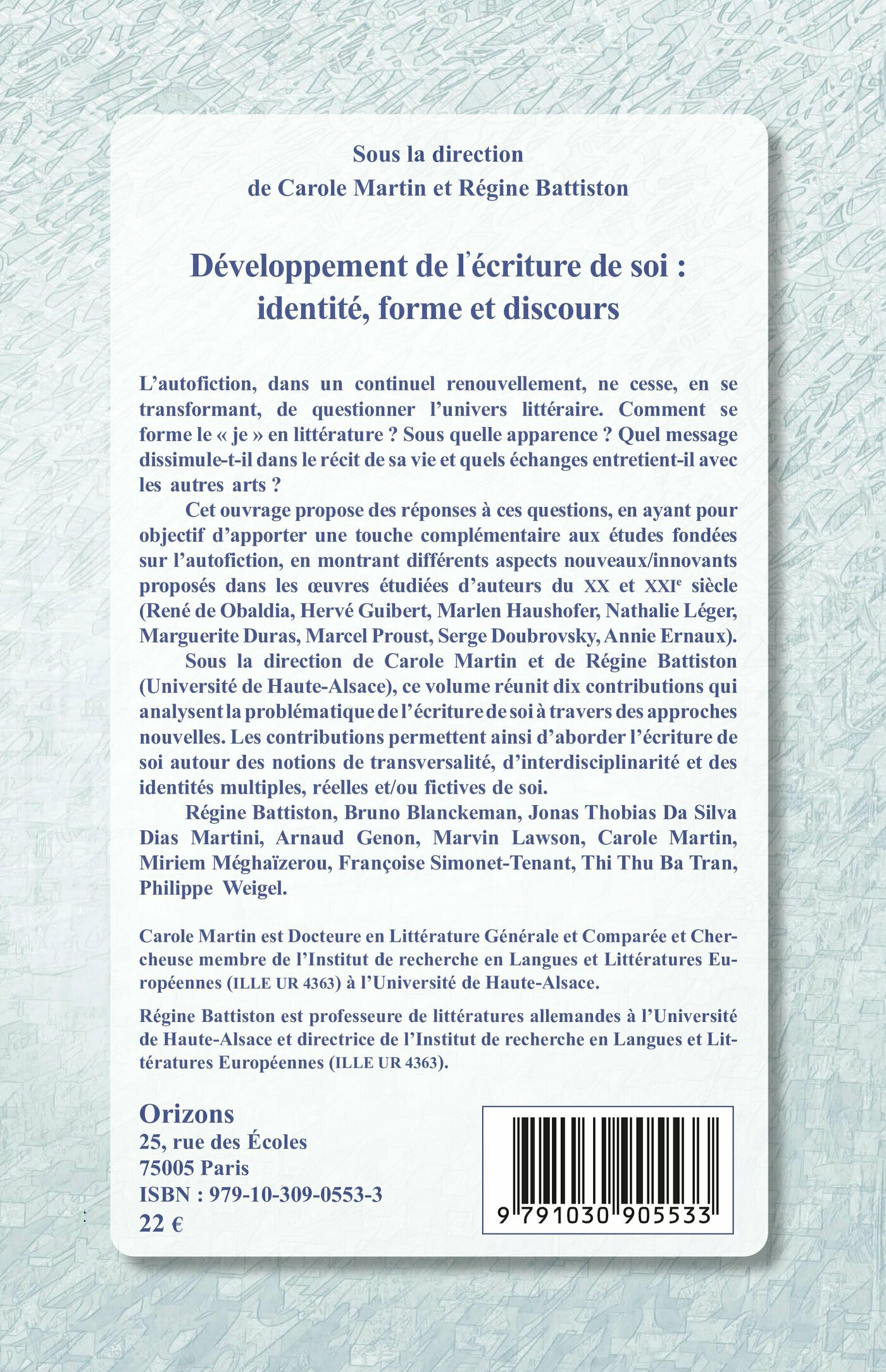 L’autofiction, dans un continuel renouvellement, ne cesse, en se transformant, de questionner l’univers littéraire. Comment se forme le « je » en littérature ? Sous quelle apparence ? Quel message dissimule-t-il dans le récit de sa vie et quels échanges entretient-il avec les autres arts ? Cet ouvrage propose des réponses à ces questions, en ayant pour objectif d’apporter une touche complémentaire aux études fondées sur l’autofiction, en montrant différents aspects nouveaux/innovants proposés dans les œuvres étudiées d’auteurs du XX et XXIe siècle (René de Obaldia, Hervé Guibert, Marlen Haushofer, Nathalie Léger, Marguerite Duras, Marcel Proust, Serge Doubrovsky, Annie Ernaux). Sous la direction de Carole Martin et de Régine Battiston (Université de Haute-Alsace), ce volume réunit dix contributions qui analysent la problématique de l’écriture de soi à travers des approches nouvelles. Les contributions permettent ainsi d’aborder l’écriture de soi autour des notions de transversalité, d’interdisciplinarité et des identités multiples, réelles et/ou fictives de soi. Régine Battiston, Bruno Blanckeman, Jonas Thobias Da Silva Dias Martini, Arnaud Genon, Marvin Lawson, Carole Martin, Miriem Méghaïzerou, Françoise Simonet-Tenant, Thi Thu Ba Tran, Philippe Weigel.