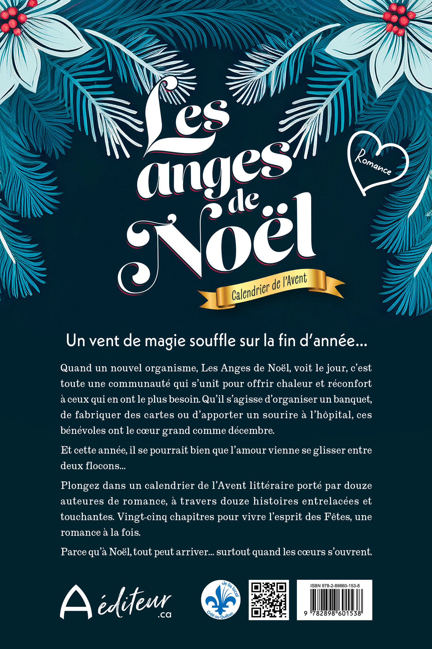 Un vent de magie souffle sur la fin d’année… Quand un nouvel organisme, Les Anges de Noël, voit le jour, c’est toute une communauté qui s’unit pour offrir chaleur et réconfort à ceux qui en ont le plus besoin. Qu’il s’agisse d’organiser un banquet, de fabriquer des cartes ou d’apporter un sourire à l’hôpital, ces bénévoles ont le coeur grand comme décembre. Et cette année, il se pourrait bien que l’amour vienne se glisser entre deux flocons… Plongez dans un calendrier de l’Avent littéraire porté par douze auteures de romance, à travers douze histoires entrelacées et touchantes. Vingt-cinq chapitres pour vivre l’esprit des Fêtes, une romance à la fois. Parce qu’à Noël, tout peut arriver…