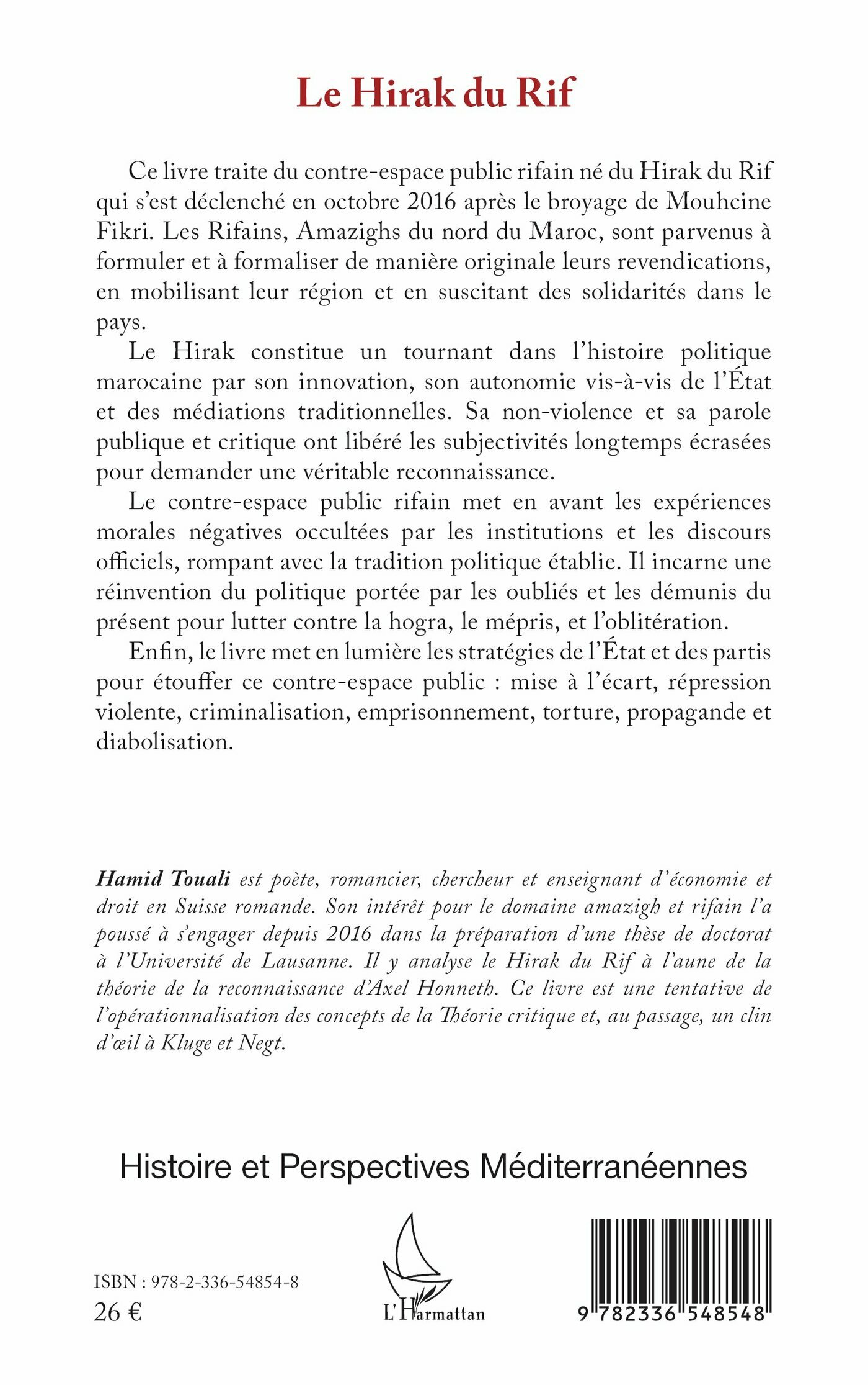 Ce livre traite du contre-espace public rifain né du Hirak du Rif qui s’est déclenché en octobre 2016 après le broyage de Mouhcine Fikri. Les Rifains, Amazighs du nord du Maroc, sont parvenus à formuler et à formaliser de manière originale leurs revendications, en mobilisant leur région et en suscitant des solidarités dans le pays.