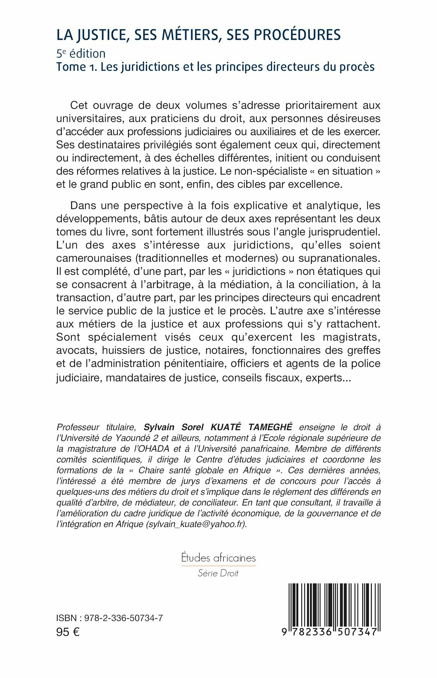 Dans une perspective à la fois explicative et analytique, les développements, bâtis autour de deux axes représentant les deux tomes du livre, sont fortement illustrés sous l’angle jurisprudentiel. L’un des axes s’intéresse aux juridictions, qu’elles soient camerounaises (traditionnelles et modernes) ou supranationales. Il est complété, d’une part, par les « juridictions » non étatiques qui se consacrent à l’arbitrage, à la médiation, à la conciliation, à la transaction, d’autre part, par les principes directeurs qui encadrent le service public de la justice et le procès. L’autre axe s’intéresse aux métiers de la justice et aux professions qui s’ y rattachent. Sont spécialement visés ceux qu’exercent les magistrats, avocats, huissiers de justice, notaires, fonctionnaires des greffes et de l’administration pénitentiaire, officiers et agents de la police judiciaire, mandataires de justice, conseils fiscaux, experts...