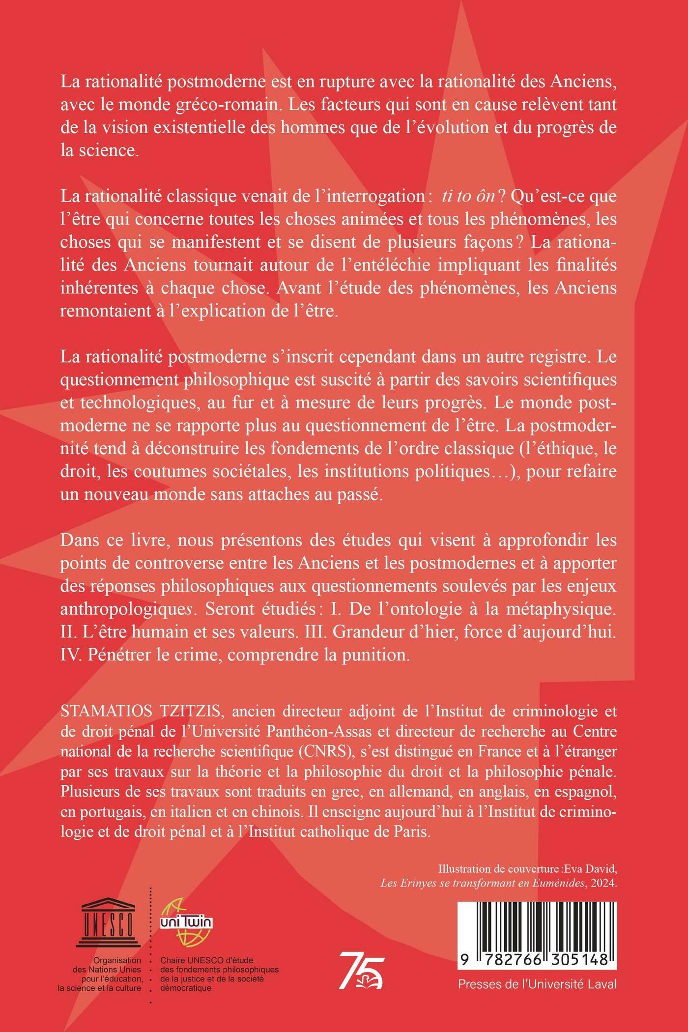 La rationalité postmoderne est en rupture avec la rationalité des Anciens, avec le monde gréco-romain. Les facteurs qui sont en cause relèvent tant de la vision existentielle des hommes que de l’évolution et du progrès de la science. La rationalité classique venait de l’interrogation : ti to ôn ? Qu’est-ce que l’être qui concerne toutes les choses animées et tous les phénomènes, les choses qui se manifestent et se disent de plusieurs façons ? La rationalité des Anciens tournait autour de l’entéléchie impliquant les finalités inhérentes à chaque chose. Avant l’étude des phénomènes, les Anciens remontaient à l’explication de l’être. La rationalité postmoderne s’inscrit cependant dans un autre registre. Le questionnement philosophique est suscité à partir des savoirs scientifiques et technologiques, au fur et à mesure de leurs progrès. Le monde postmoderne ne se rapporte plus au questionnement de l’être. La postmodernité tend à déconstruire les fondements de l’ordre classique (l’éthique, le droit, les coutumes sociétales, les institutions politiques…), pour refaire un nouveau monde sans attaches au passé. Dans ce livre, nous présentons des études qui visent à approfondir les points de controverse entre les Anciens et les post-modernes et à apporter des réponses philosophiques aux questionnements soulevés par les enjeux anthropologiques.