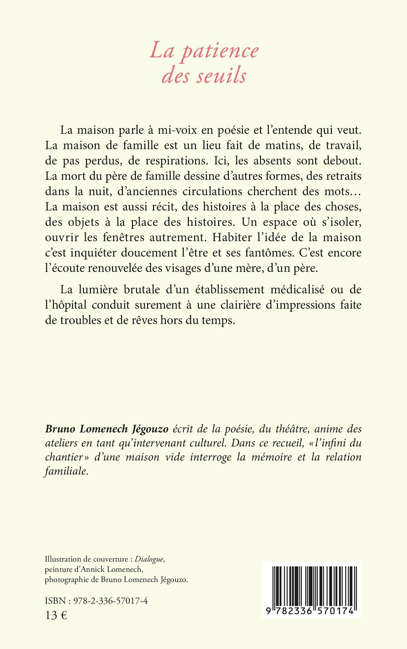 La maison parle à mi-voix en poésie et l’entende qui veut. La maison de famille est un lieu fait de matins, de travail, de pas perdus, de respirations. Ici, les absents sont debout. La mort du père de famille dessine d’autres formes, des retraits dans la nuit, d’anciennes circulations cherchent des mots… La maison est aussi récit, des histoires à la place des choses, des objets à la place des histoires. Un espace où s’isoler, ouvrir les fenêtres autrement. Habiter l’idée de la maison c’est inquiéter doucement l’être et ses fantômes. C’est encore l’écoute renouvelée des visages d’une mère, d’un père.