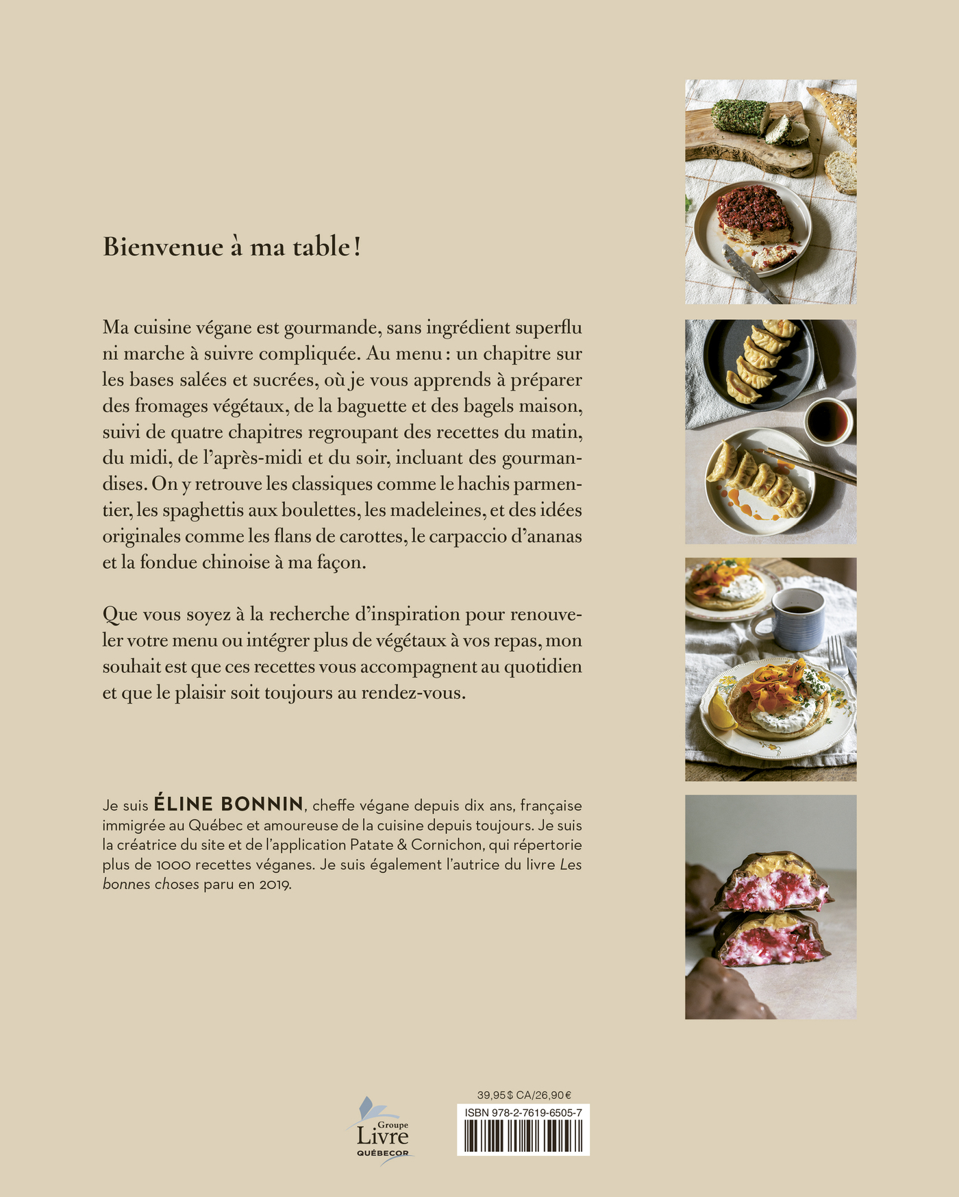 Ma cuisine végane est gourmande, sans ingrédient superflu ni marche à suivre compliquée. Au menu : un chapitre sur les bases salées et sucrées, où je vous apprends à préparer des fromages végétaux, de la baguette et des bagels maison, suivi de quatre chapitres regroupant des recettes du matin, du midi, de l'après-midi et du soir, incluant des gourmandises. On y retrouve les classiques comme le hachis parmentier, les spaghettis aux boulettes, les madeleines, et des idées originales comme les flans de carottes, le carpaccio d'ananas et la fondue chinoise à ma façon.