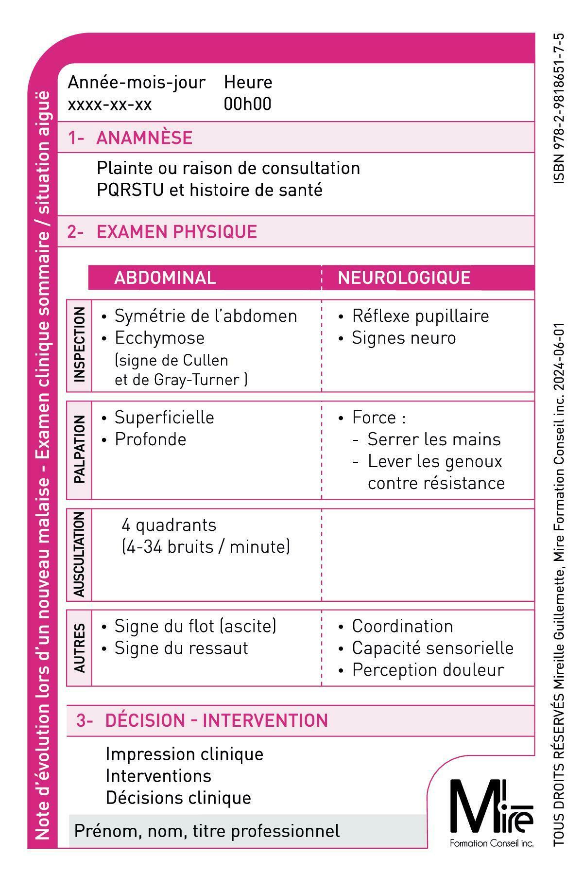Cartes fiches aide-mémoire pratiques.Pour une rédaction claire, complète et organisée.Les cartes fiches aide-mémoire sont conçues pour soutenir les infirmières et les infirmières auxiliaires dans la rédaction quotidienne de leurs notes au dossier.Claires, concises et axées sur la pratique clinique, ces fiches sont des outils précieux pour structurer l’information de manière efficace et conforme aux bonnes pratiques.