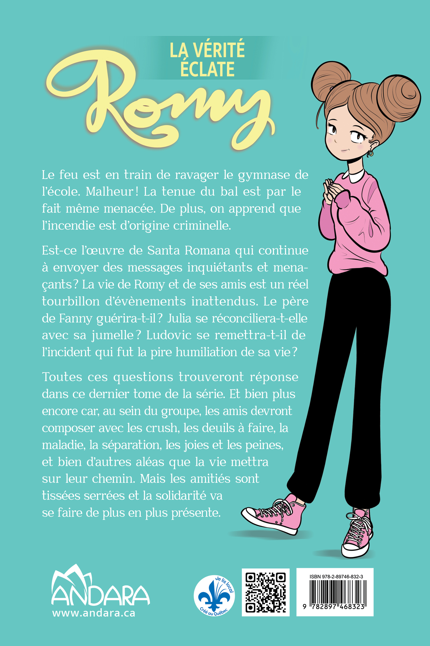 Le feu est en train de ravager le gymnase de l’école. Malheur ! La tenue du bal est par le fait même menacée. De plus, on apprend que l’incendie est d’origine criminelle. Est-ce l’oeuvre de Santa Romana qui continue à envoyer des messages inquiétants et menaçants ? La vie de Romy et de ses amis est un réel tourbillon d’évènements inattendus. Le père de Fanny guérira-t-il ? Julia se réconciliera-t-elle avec sa jumelle ? Ludovic se remettra-t-il de l’incident qui fut la pire humiliation de sa vie ? Toutes ces questions trouveront réponse dans ce dernier tome de la série.
