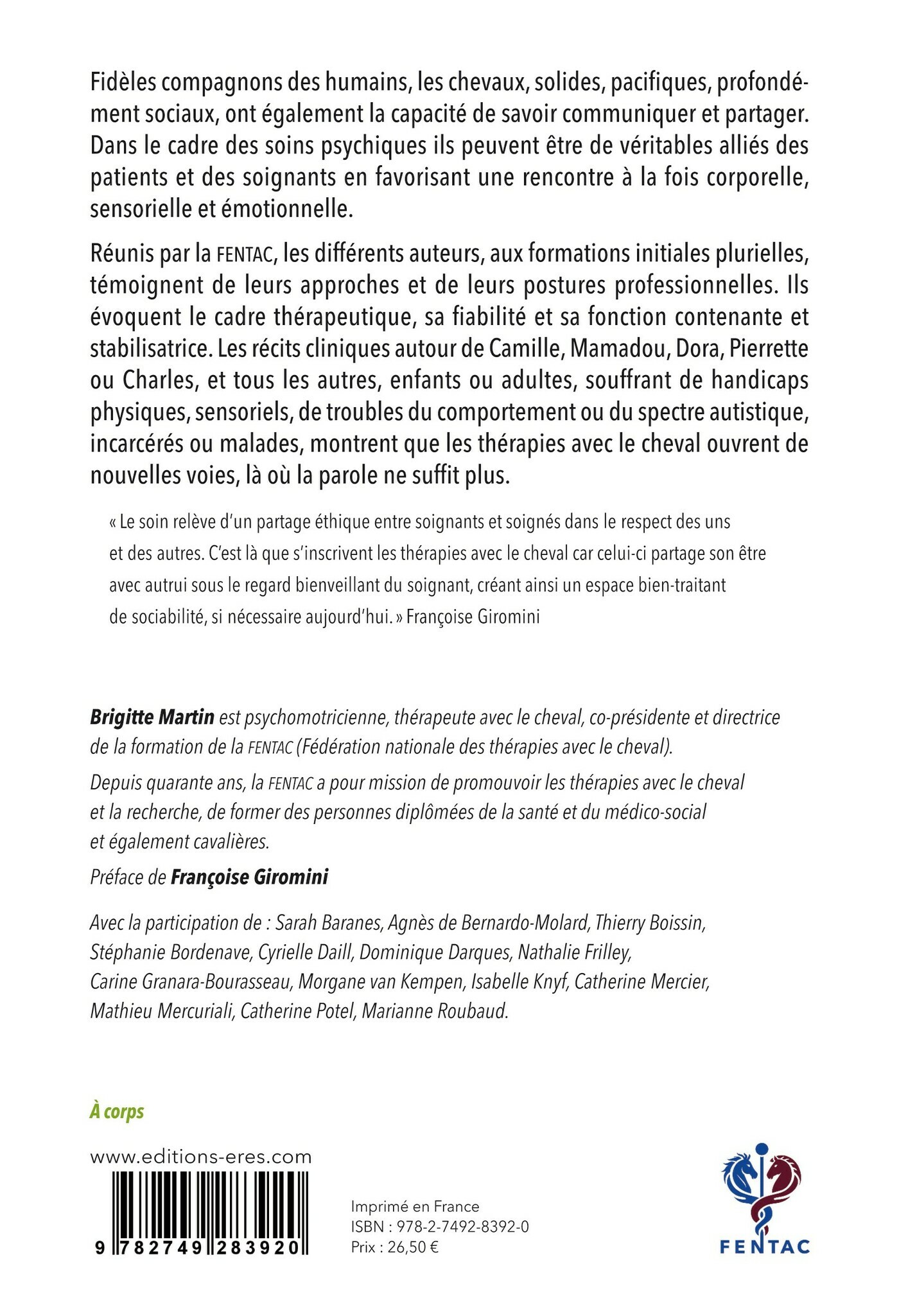 Réunis par la FENTAC, les différents auteurs, aux formations initiales plurielles, témoignent de leurs approches et de leurs postures professionnelles. Ils évoquent le cadre thérapeutique, sa fiabilité et sa fonction contenante et stabilisatrice. Les récits cliniques autour de Camille, Mamadou, Dora, Pierrette ou Charles, et tous les autres, enfants ou adultes, souffrant de handicaps physiques, sensoriels, de troubles du comportement ou du spectre autistique, incarcérés ou malades, montrent que les thérapies avec le cheval ouvrent de nouvelles voies, là où la parole ne suffit plus.