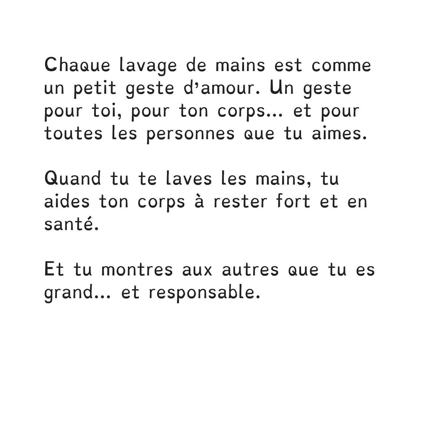 Ce livre explique aux enfants pourquoi il est important de se laver les mains, même quand elles paraissent propres. À travers des explications simples et rassurantes, il montre comment l’eau et le savon chassent les microbes invisibles. L’enfant apprend et découvre une routine amusante pour rester en santé et protéger les autres. Bonne lecture !