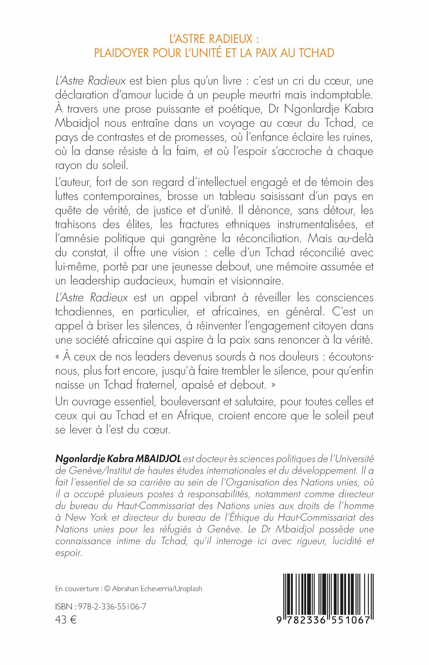 L’Astre Radieux est bien plus qu’un livre : c’est un cri du cœur, une déclaration d’amour lucide à un peuple meurtri mais indomptable. À travers une prose puissante et poétique, Dr Ngonlardje Kabra Mbaidjol nous entraîne dans un voyage au cœur du Tchad, ce pays de contrastes et de promesses, où l’enfance éclaire les ruines, où la danse résiste à la faim, et où l’espoir s’accroche à chaque rayon du soleil.