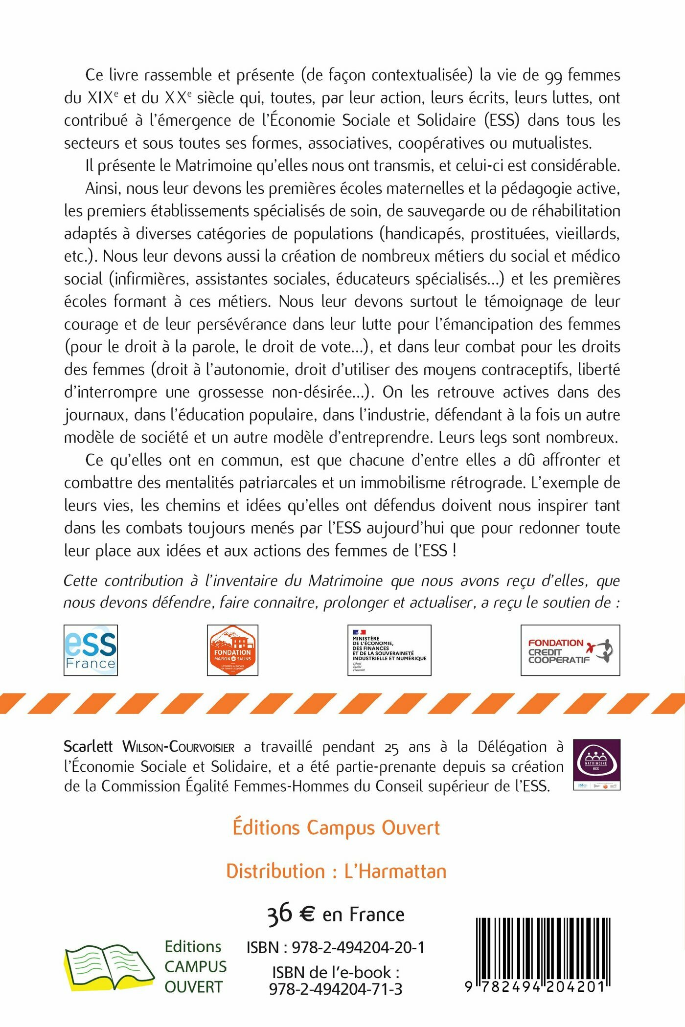 Ce livre rassemble et présente (de façon contextualisée) la vie de 99 femmes du XIX° et du XX° siècle qui, toutes, par leur action, leurs écrits, leurs luttes, ont contribué à l’émergence de l’Économie Sociale et Solidaire (ESS) dans tous les secteurs et sous toutes ses formes, associatives, coopératives ou mutualistes. Il présente le Matrimoine qu’elles nous ont transmis, et celui-ci est considérable. Ainsi, nous leur devons les premières écoles maternelles et la pédagogie active, les premiers établissements spécialisés de soin, de sauvegarde ou de réhabilitation adaptés à diverses catégories de populations (handicapés, prostituées, vieillards, etc.). Nous leur devons aussi la création de nombreux métiers du social et médico social (infirmières, assistantes sociales, éducateurs spécialisés…) et les premières écoles formant à ces métiers. Nous leur devons surtout le témoignage de leur courage et de leur persévérance dans leur lutte pour l’émancipation des femmes (pour le droit à la parole, le droit de vote…), et dans leur combat pour les droits des femmes (droit à l’autonomie, droit d’utiliser des moyens contraceptifs, liberté d’interrompre une grossesse non-désirée…). On les retrouve actives dans des journaux, dans l’éducation populaire, dans l’industrie, défendant à la fois un autre modèle de société et un autre modèle d’entreprendre. Leurs legs sont nombreux. Ce qu’elles ont en commun, est que chacune d’entre elles a dû affronter et combattre des mentalités patriarcales et un immobilisme rétrograde. L’exemple de leurs vies, les chemins et idées qu’elles ont défendus doivent nous inspirer tant dans les combats toujours menés par l’ESS aujourd’hui que pour redonner toute leur place aux idées et aux actions des femmes de l’ESS !