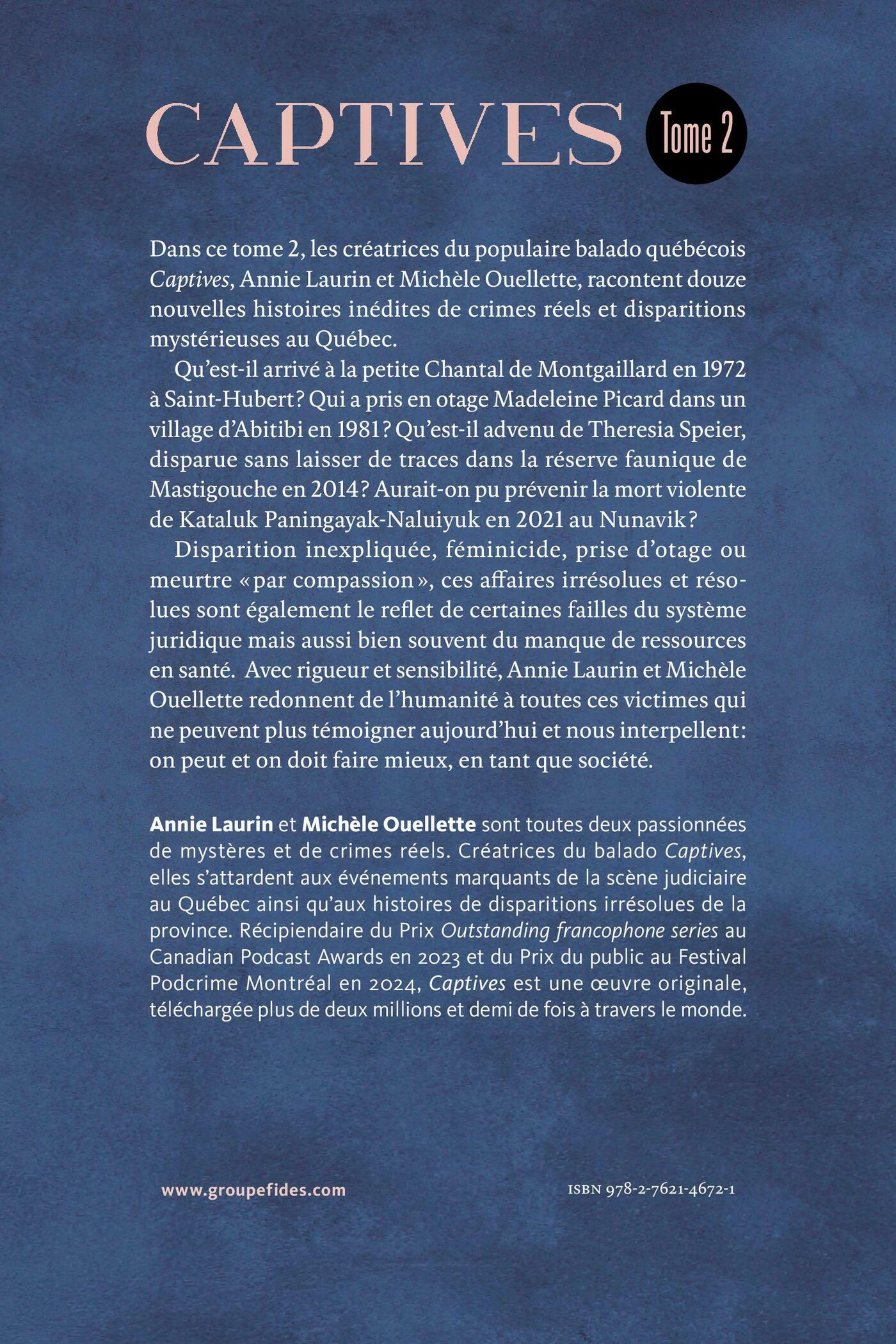 Dans ce tome 2, les créatrices du populaire balado québécois Captives, Annie Laurin et Michèle Ouellette, racontent douze nouvelles histoires inédites de crimes réels et disparitions mystérieuses au Québec.Qu’est-il arrivé à la petite Chantal de Montgaillard en 1972 à Saint-Hubert? Qui a pris en otage Madeleine Picard dans un village d’Abitibi en 1981 ? Qu’est-il advenu de Theresia Speier, disparue sans laisser de traces dans la réserve faunique de Mastigouche en 2014? Aurait-on pu prévenir la mort violente de Kataluk Paningayak-Naluiyuk en 2021 au Nunavik?Disparition inexpliquée, féminicide, prise d’otage ou meurtre « par compassion», ces affaires irrésolues et résolues sont également le reflet de certaines failles du système juridique mais aussi bien souvent du manque de ressources en santé. Avec rigueur et sensibilité, Annie Laurin et Michèle Ouellette redonnent de l’humanité à toutes ces victimes qui ne peuvent plus témoigner aujourd’hui et nous interpellent: on peut et on doit faire mieux, en tant que société.