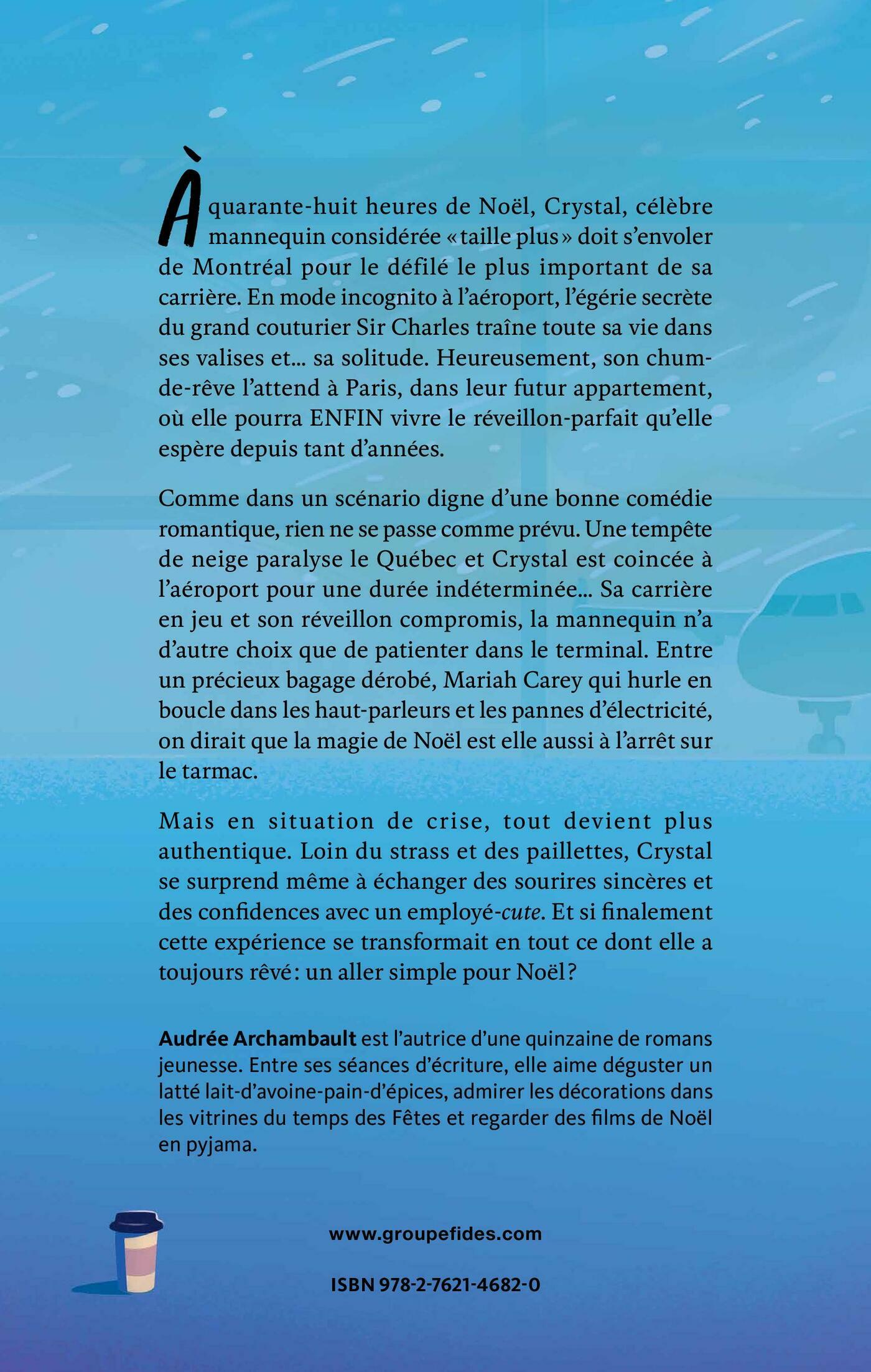 À quarante-huit heures de Noël, Crystal, célèbre mannequin considérée « taille plus » doit s’envoler de Montréal pour le défilé le plus important de sa carrière. En mode incognito à l’aéroport, l’égérie secrète du grand couturier Sir Charles traîne toute sa vie dans ses valises et… sa solitude. Heureusement, son chum-de-rêve l’attend à Paris, dans leur futur appartement, où elle pourra ENFIN vivre le réveillon-parfait qu’elle espère depuis tant d’années.Comme dans un scénario digne d’une bonne comédie romantique, rien ne se passe comme prévu. Une tempête de neige paralyse le Québec et Crystal est coincée à l’aéroport pour une durée indéterminée… Sa carrière en jeu et son réveillon compromis, la mannequin n’a d’autre choix que de patienter dans le terminal. Entre un précieux bagage dérobé, Mariah Carey qui hurle en boucle dans les haut-parleurs et les pannes d’électricité, on dirait que la magie de Noël est elle aussi à l’arrêt sur le tarmac.Mais en situation de crise, tout devient plus authentique. Loin du strass et des paillettes, Crystal se surprend même à échanger des sourires sincères et des confidences avec un employé-cute. Et si finalement cette expérience se transformait en tout ce dont elle a toujours rêvé : un aller simple pour Noël ?