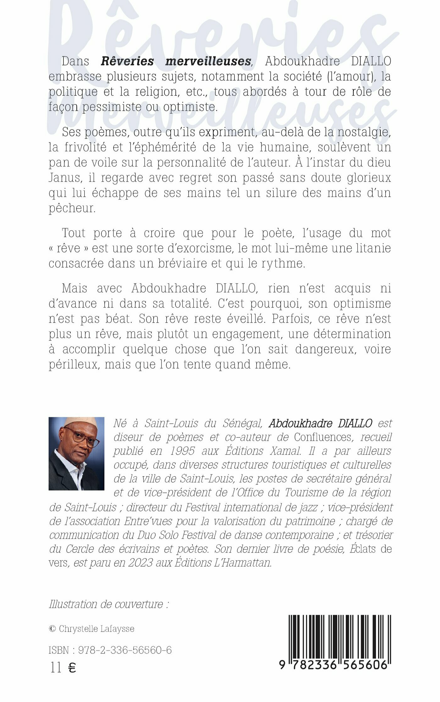 Dans Rêveries merveilleuses, Abdoukhadre DIALLO embrasse plusieurs sujets, notamment la société (l’amour), la politique et la religion, etc., tous abordés à tour de rôle de façon pessimiste ou optimiste.
