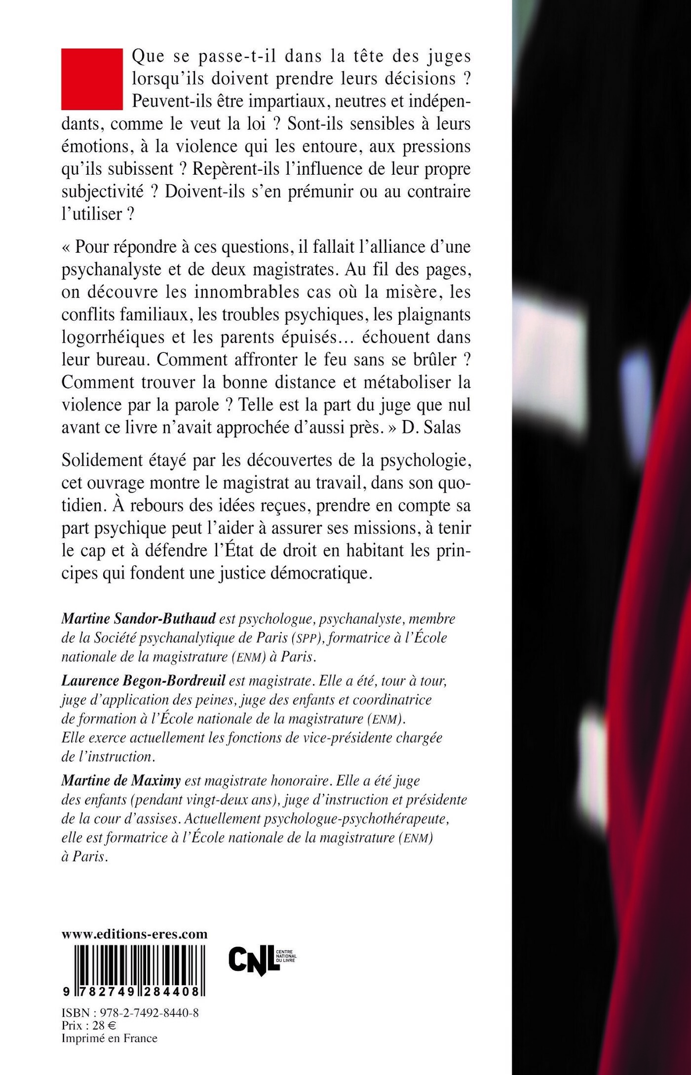 Solidement étayé par les découvertes de la psychologie, cet ouvrage montre le magistrat au travail, dans son quotidien. À rebours des idées reçues, prendre en compte sa part psychique peut l’aider à assurer ses missions, à tenir le cap et à défendre l’État de droit en habitant les principes qui fondent une justice démocratique.