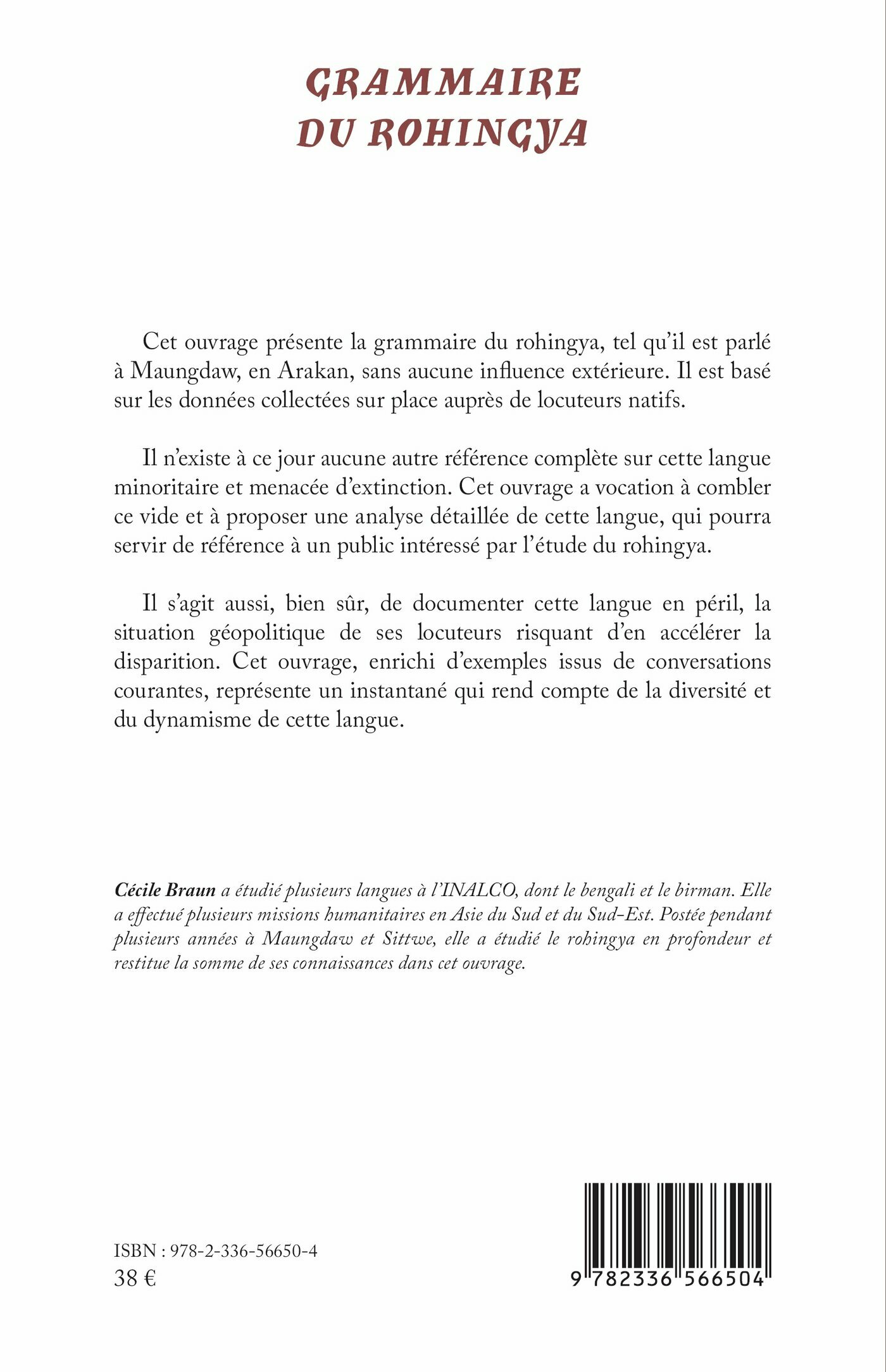 Il n’existe à ce jour aucune autre référence complète sur cette langue minoritaire et menacée d’extinction. Cet ouvrage a vocation à combler ce vide et à proposer une analyse détaillée de cette langue, qui pourra servir de référence à un public intéressé par l’étude du rohingya.
