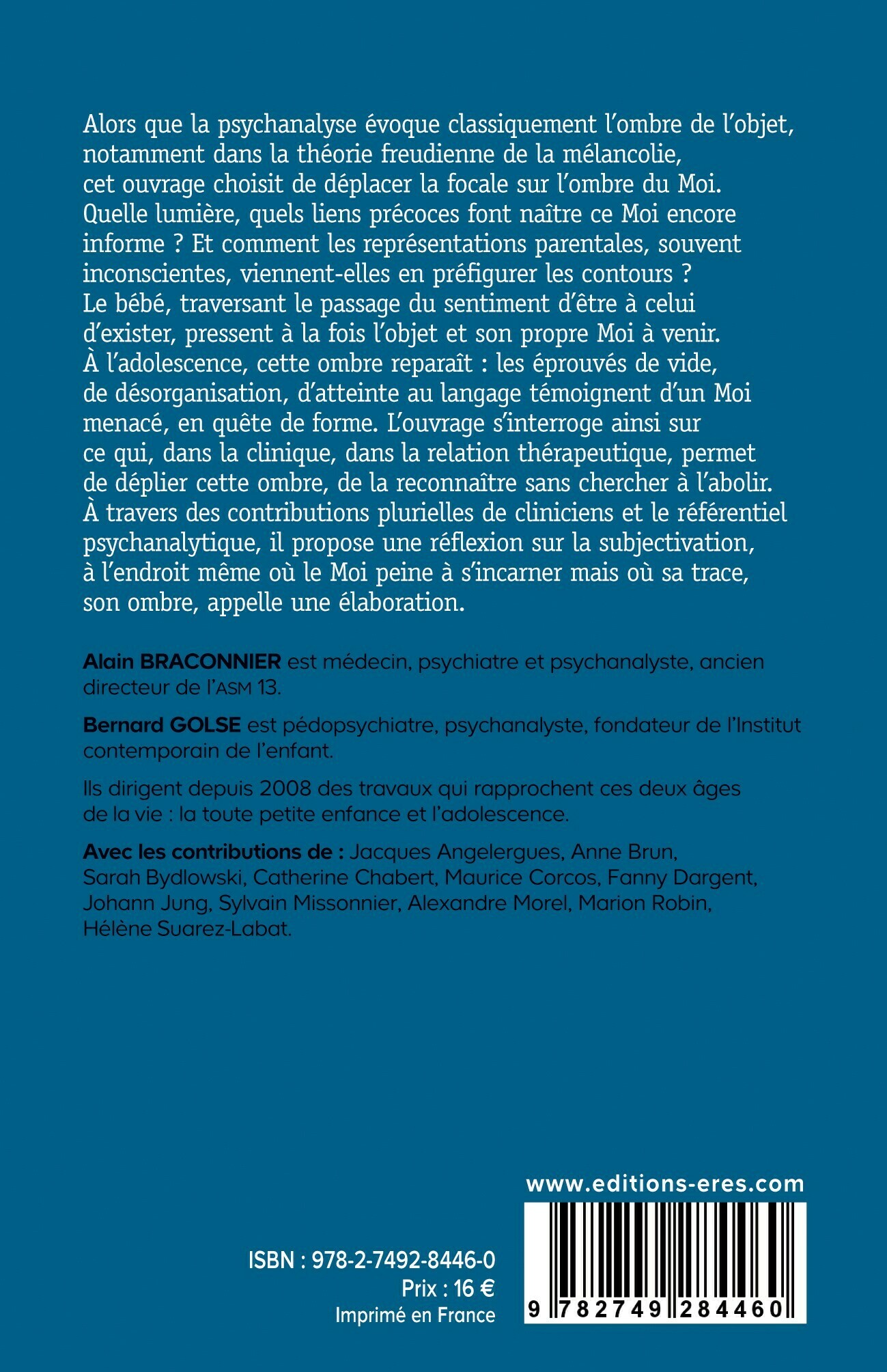 Quelle lumière, quels liens précoces font naître ce Moi encore informe ? Et comment les représentations parentales, souvent inconscientes, viennent-elles en préfigurer les contours ? Le bébé, traversant le passage du sentiment d’être à celui d’exister, pressent à la fois l’objet et son propre Moi à venir. À l’adolescence, cette ombre reparaît : les éprouvés de vide, de désorganisation, d’atteinte au langage, témoignent d’un Moi menacé, en quête de forme. L’ouvrage s’interroge ainsi sur ce qui, dans la clinique, dans la relation thérapeutique, permet de déplier cette ombre, de la reconnaître sans chercher à l’abolir. À travers des contributions plurielles de cliniciens et le référentiel psychanalytique, il propose une réflexion sur la subjectivation, à l’endroit même où le Moi peine à s’incarner mais où sa trace, son ombre, appelle une élaboration.
