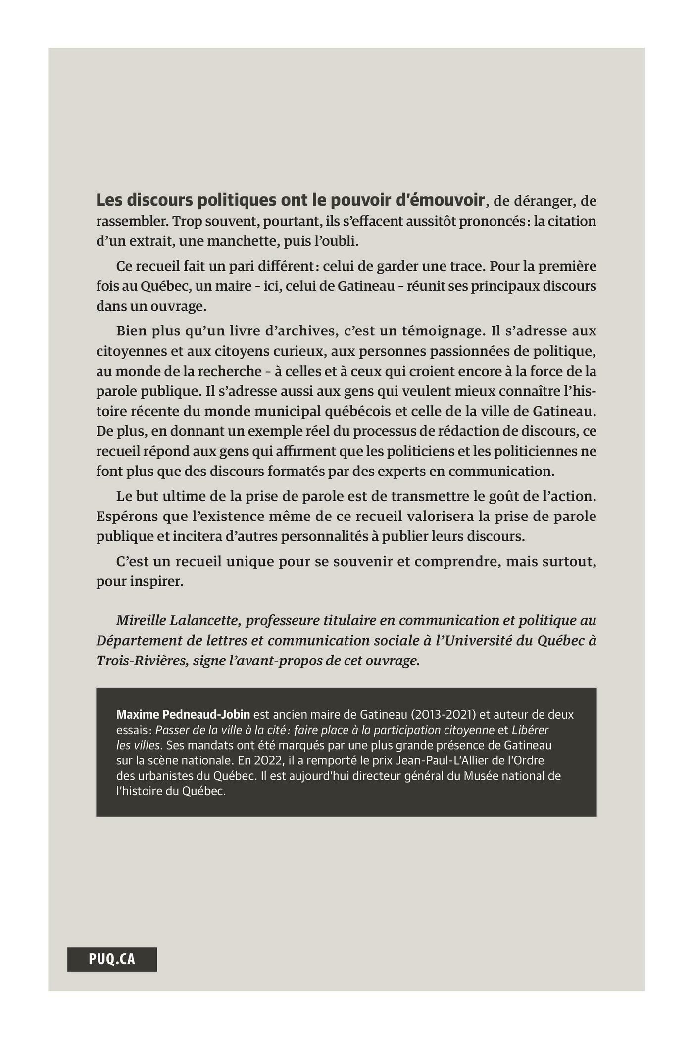 Ce recueil fait un pari différent : celui de garder une trace. Pour la première fois au Québec, un maire – ici, celui de Gatineau – réunit ses principaux discours dans un ouvrage.