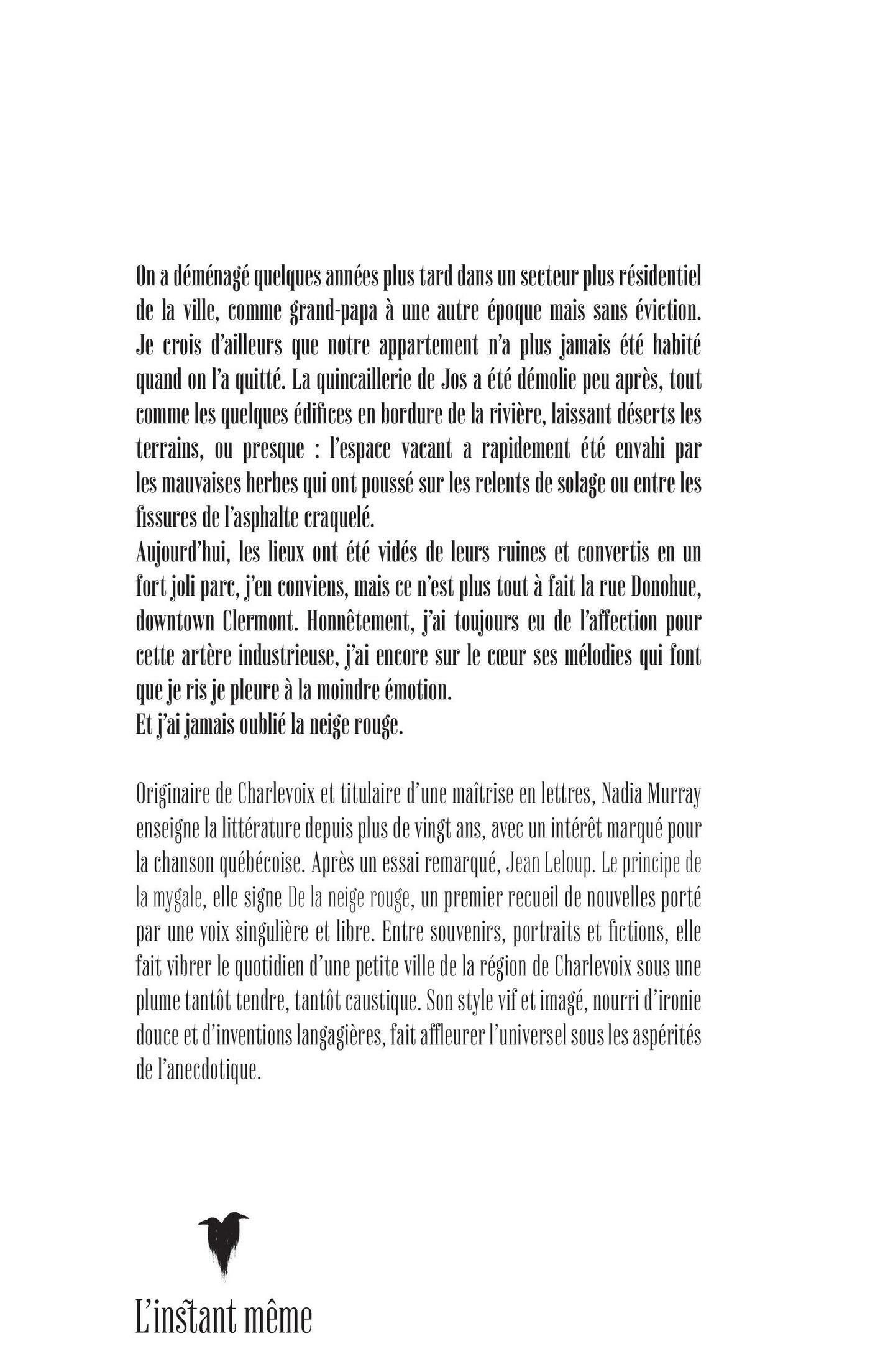 De la neige rouge est un recueil de récits tantôt tendres, tantôt caustiques, qui s’attachent à faire vibrer le quotidien d’une petite ville de Charlevoix sous une plume pleine d’ironie douce, de lucidité poétique et d’inventions langagières. Hommage vibrant à ce territoire, l’ouvrage entrelace souvenirs personnels, portraits de figures locales et fictions.La variété des formes et des tonalités dessine une cartographie intérieure, mouvante et libre. Cette liberté formelle donne toute sa résonance à une voix singulière, capable de passer de l’évocation poignante à la chronique drôle et incisive sans jamais perdre de sa justesse.On y découvre le regard d’une autrice à l’écoute du réel, avec cette capacité rare à faire affleurer l’universel sous les aspérités de l’anecdotique. Le style, vif,imagé, plein de jeux de langage, charmera les lecteurs attentifs à l’écriture autant qu’à la mémoire des lieux.