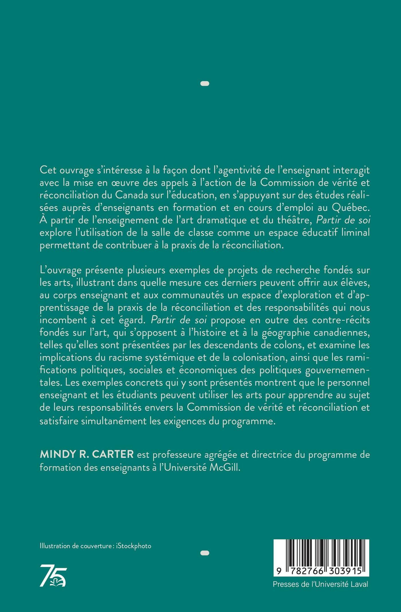 L’ouvrage présente plusieurs exemples de projets de recherche fondés sur les arts, illustrant dans quelle mesure ces derniers peuvent offrir aux élèves, au corps enseignant et aux communautés, un espace d’exploration et d’apprentissage de la praxis de la réconciliation et des responsabilités qui nous incombent à cet égard. Partir de soi propose en outre des contre-récits fondés sur l’art, qui s’opposent à l’histoire et à la géographie canadiennes, telles qu'elles sont présentées par les descendants de colons, et examine les implications du racisme systémique et de la colonisation, ainsi que les ramifications politiques, sociales et économiques des politiques gouvernementales. Les exemples concrets qui y sont présentés montrent que le personnel enseignant et les étudiants peuvent utiliser les arts pour apprendre au sujet de leurs responsabilités envers la Commission de vérité et réconciliation et satisfaire simultanément les exigences du programme.