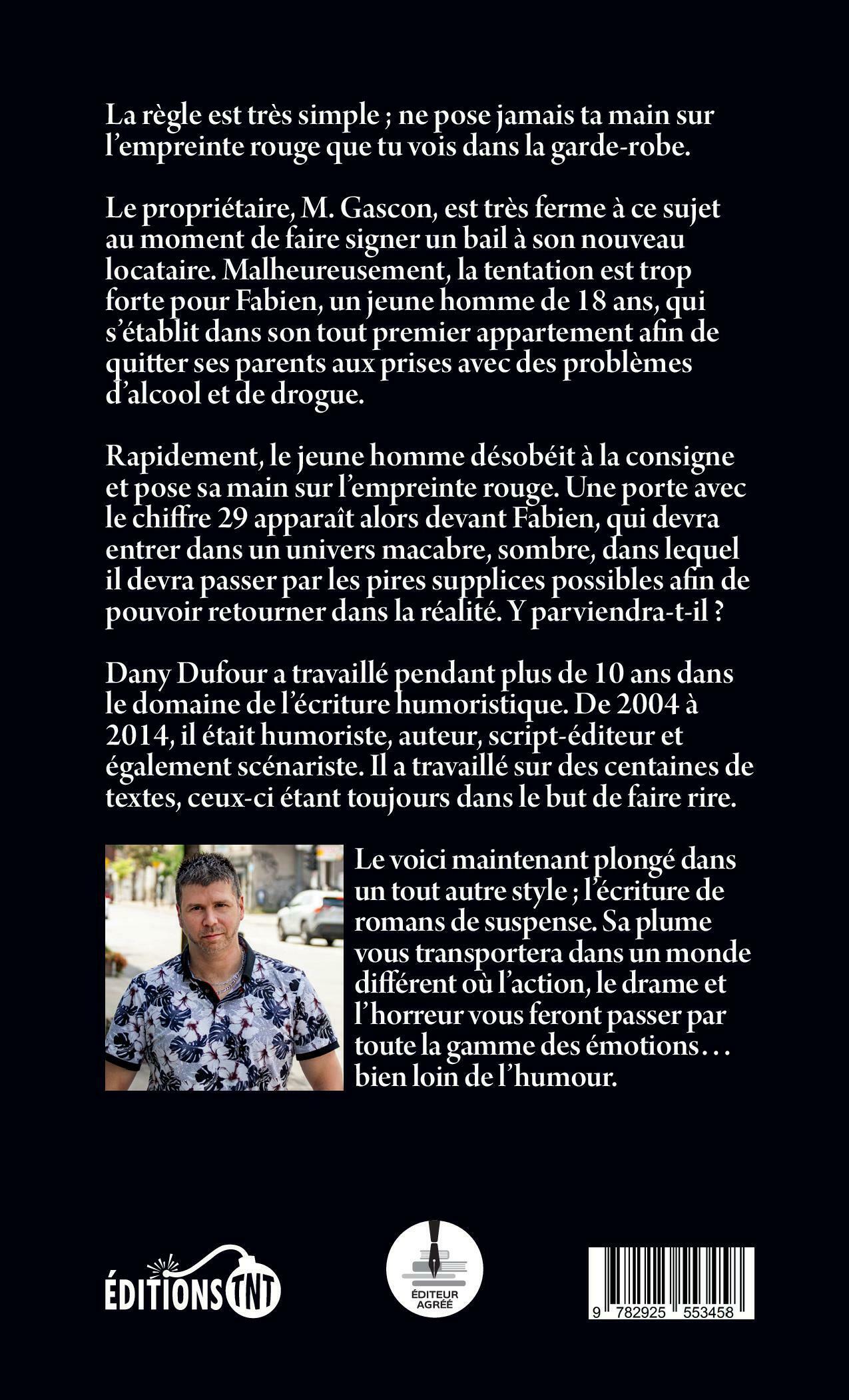 La règle est très simple ; ne pose jamais ta main sur l’empreinte rouge que tu vois dans la garde-robe.Le propriétaire, M. Gascon, est très ferme à ce sujet au moment de faire signer un bail à son nouveau locataire. Malheureusement, la tentation est trop forte pour Fabien, un jeune homme de 18 ans, qui s’établit dans son tout premier appartement afin de quitter ses parents aux prises avec des problèmes d’alcool et de drogue. Rapidement, le jeune homme désobéit à la consigne et pose sa main sur l’empreinte rouge. Une porte avec le chiffre 29 apparaît alors devant Fabien, qui devra entrer dans un univers macabre, sombre, dans lequel il devra passer par les pires supplices possibles afin de pouvoir retourner dans la réalité. Y parviendra-t-il ?Dany Dufour a travaillé pendant plus de 10 ans dans le domaine de l’écriture humoristique. De 2004 à 2014, il était humoriste, auteur, script-éditeur et également scénariste. Il a travaillé sur des centaines de textes, ceux-ci étant toujours dans le but de faire rire.Le voici maintenant plongé dans un tout autre style ; l’écriture de romans de suspense. Sa plume vous transportera dans un monde différent où l’action, le drame et l’horreur vous feront passer par toute la gamme des émotions… bien loin de l’humour.