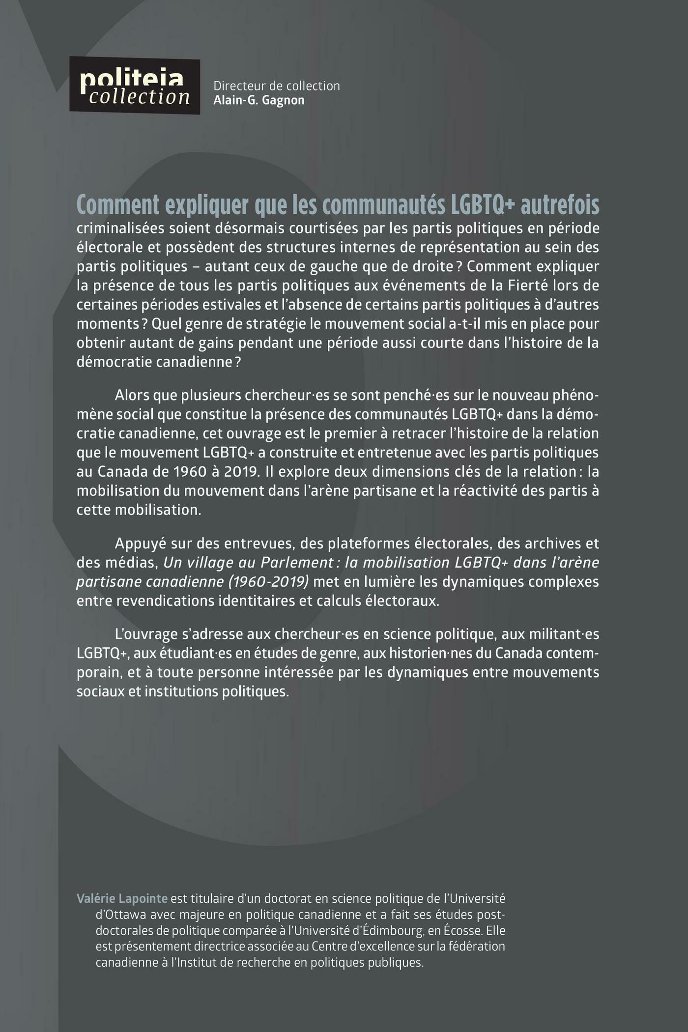 Appuyé sur des entrevues, des plateformes électorales, des archives et des médias, Un village au Parlement : la mobilisation LGBTQ+ dans l’arène partisane canadienne (1960-2019) met en lumière les dynamiques complexes entre revendications identitaires et calculs électoraux.
